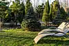 Высокие сосны, стройные ели и статные тисы создают мягкую тень, под которой распростерлись кустарники можжевельника, туи и самшиты. Кипарисы своими острыми верхушками устремляются к небу, придавая всему пространству торжественность и величие. Ухоженные газоны, покрытые мягким ковром, разбавлены яркими пятнами цветников, наполняющих воздух нежными ароматами.