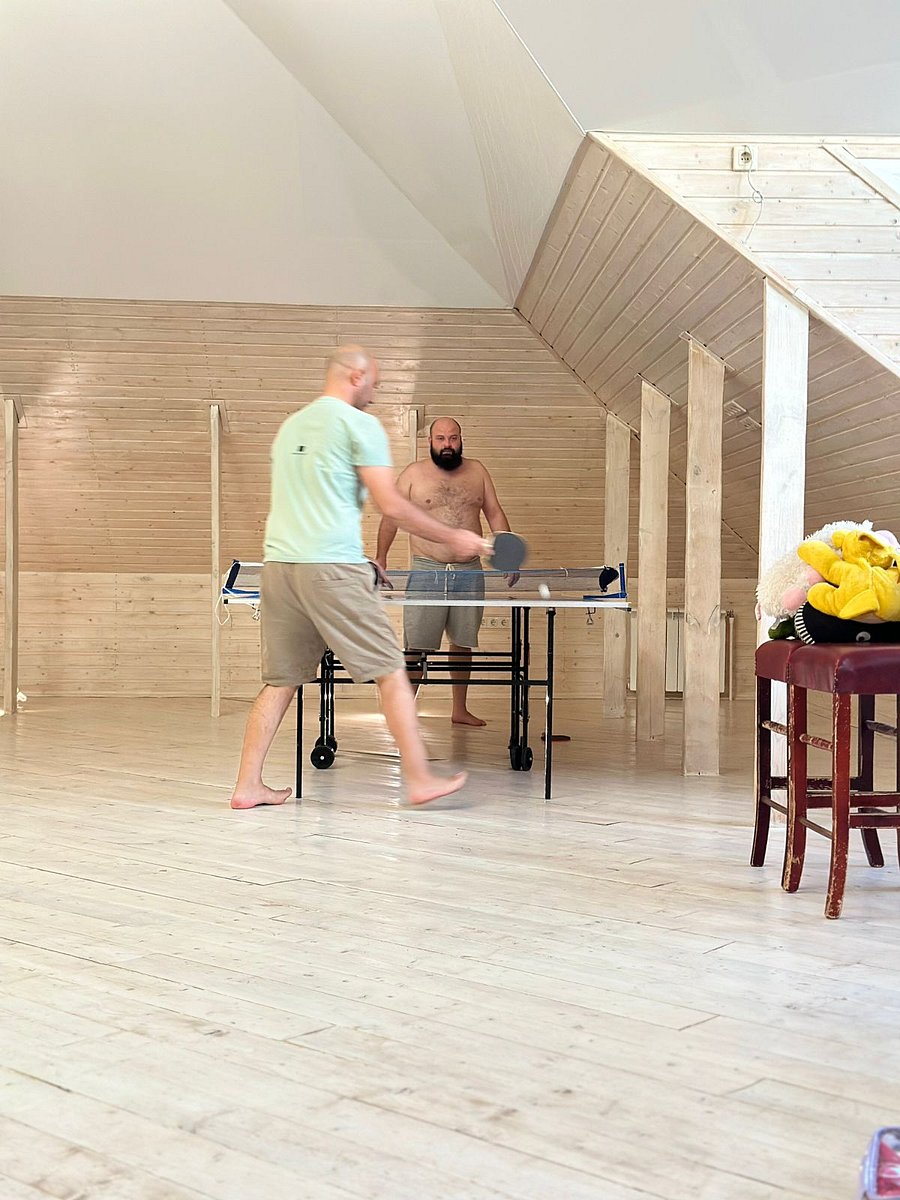 Поднимаясь на второй этаж уютного домика в стиле шале, вы попадаете в настоящую зону активного отдыха. Здесь расположился теннисный стол, приглашающий гостей испытать свои силы в этой захватывающей игре.