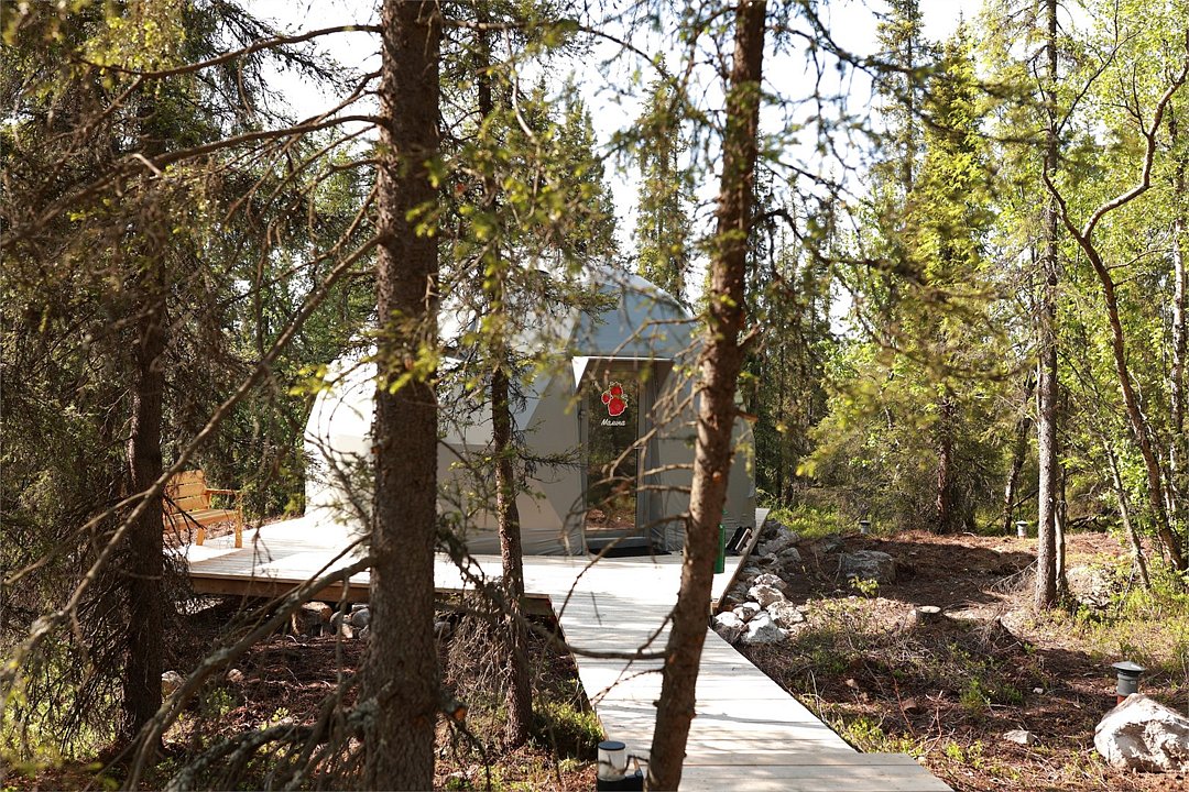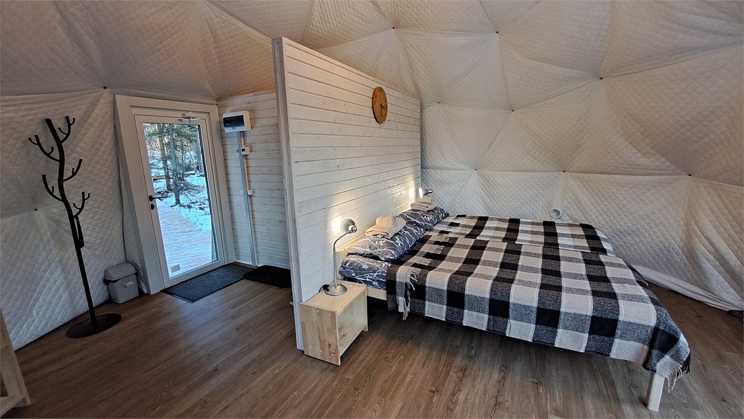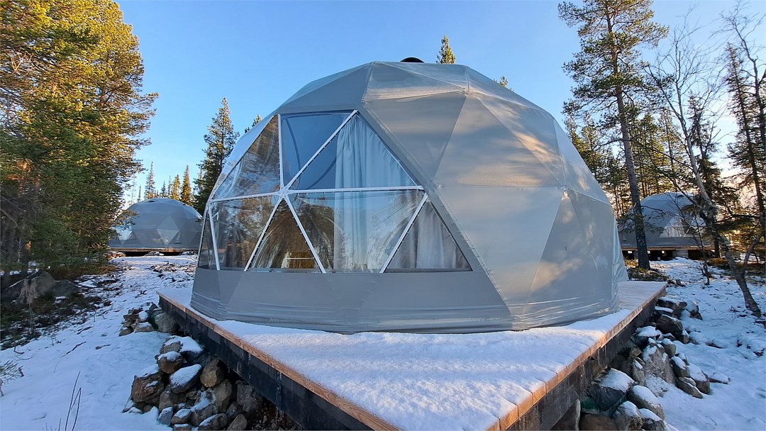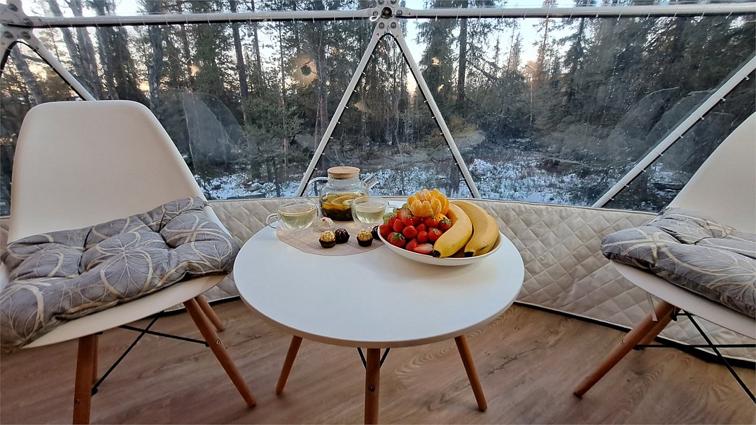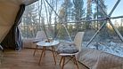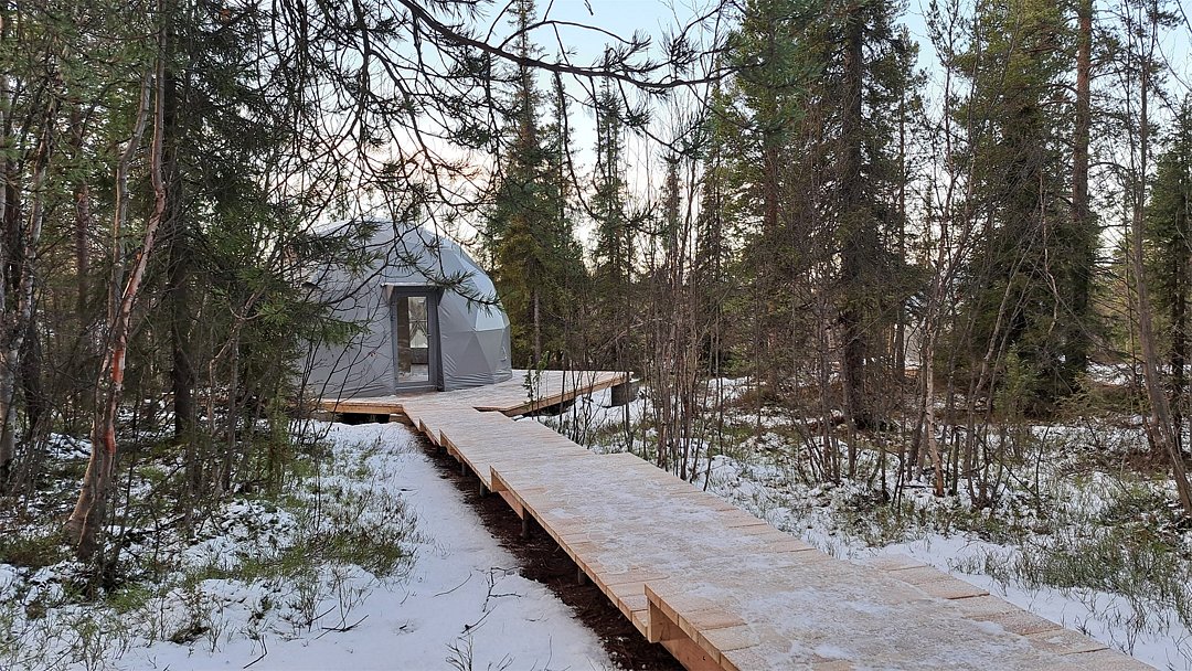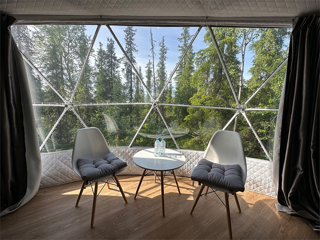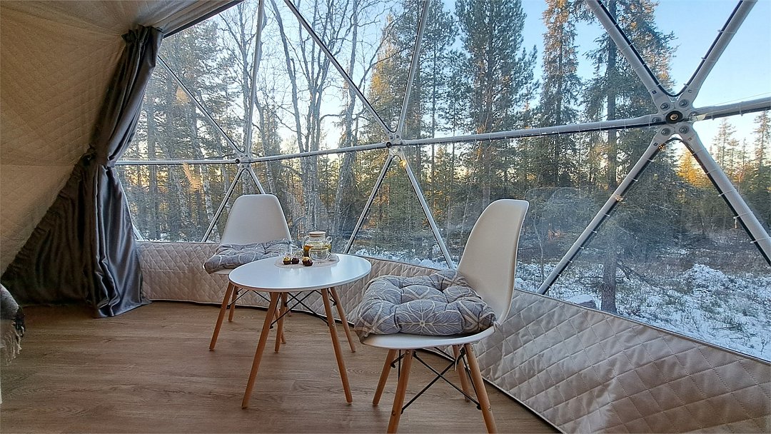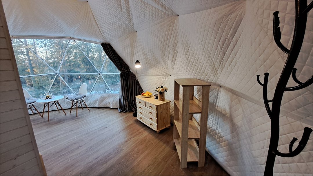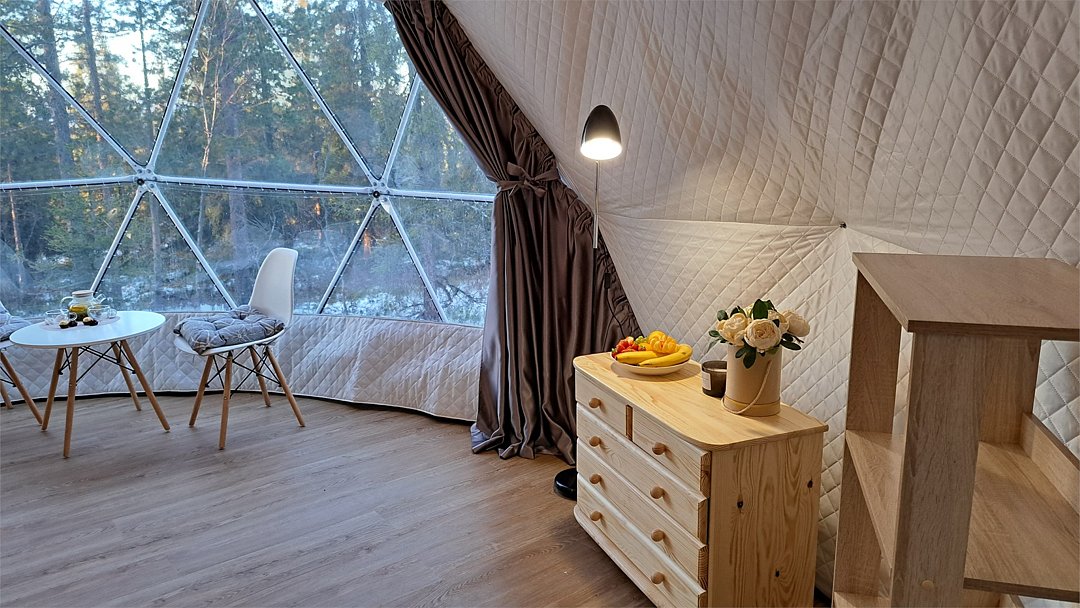 Утепленный эко-шатёр диаметром 6м с большим панорамным окном, которое при необходимости можно завесить плотными шторами. Электрическое отопление (тёплый пол), кондиционер и трёхслойное утепление стенок шатра позволяют поддерживать в нем комфортную температуру в любое время года. В эко-шатре есть ванная комната с душем и бесплатными туалетно-косметическими принадлежностями. Площадь 28 м2, рассчитан на комфортное размещение до 2 человек. В оснащение каждого шатра входит: - две односпальные кровати с возможностью объединить их в одну большую; - столик и два стула; - комод для хранения вещей; - вешалка для одежды; - светильники и электрические розетки; - электрическим чайником и набором чайной посуды; - санузел (душевая кабина, туалет, раковина, набор полотенец); - открытой террасой со скамейками.Услуги и удобства