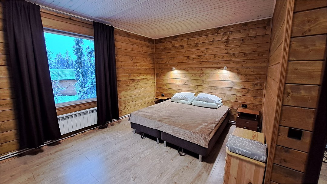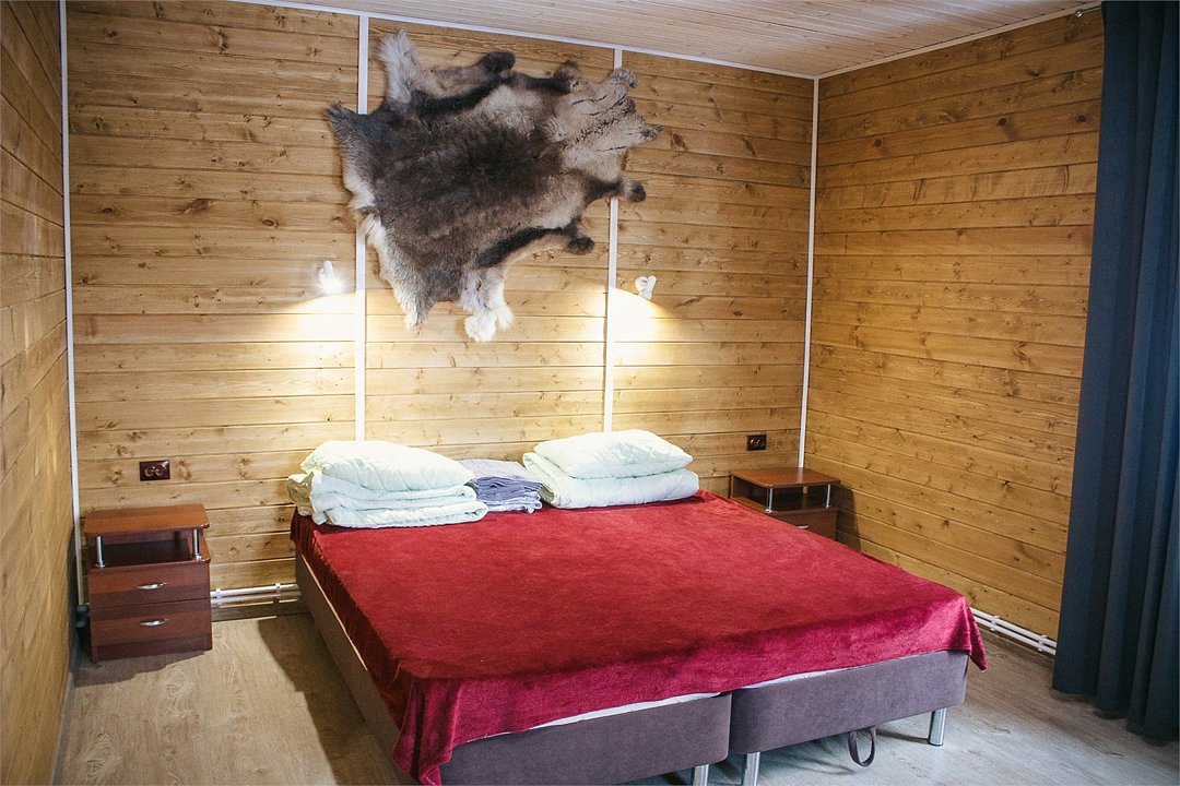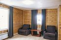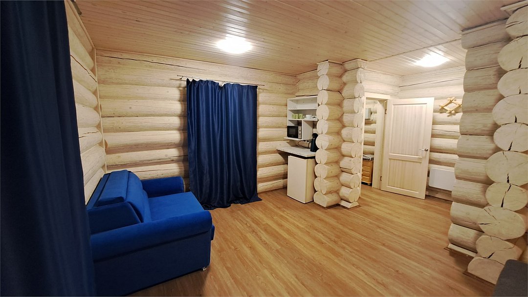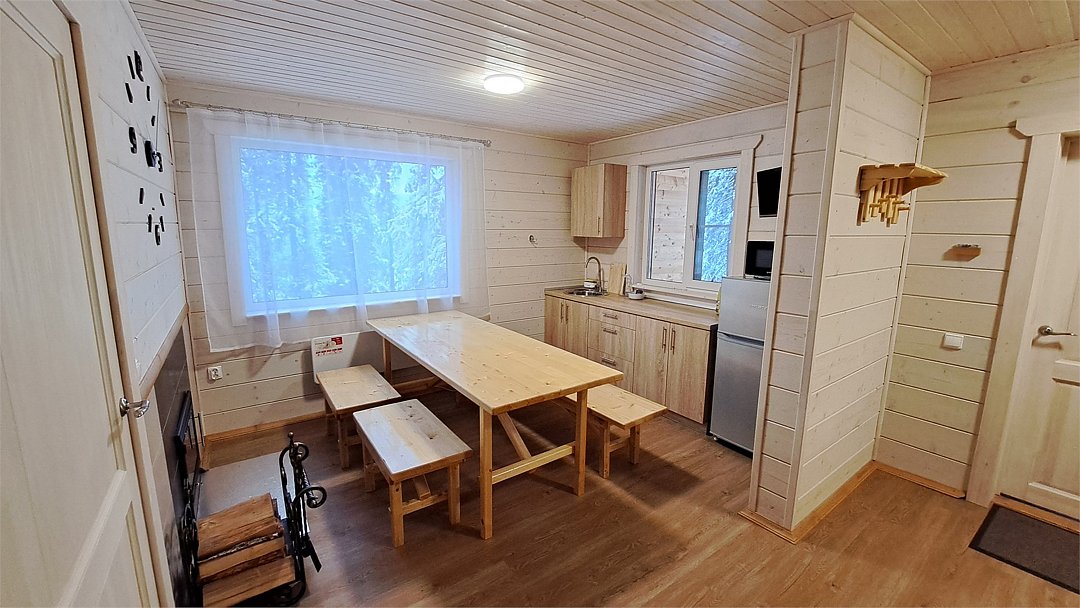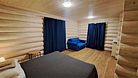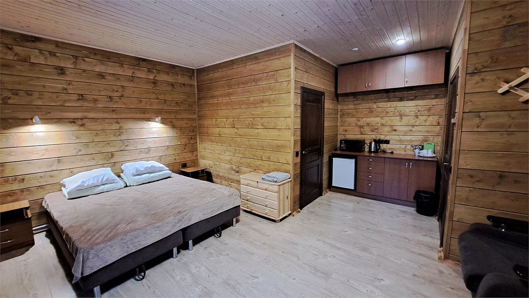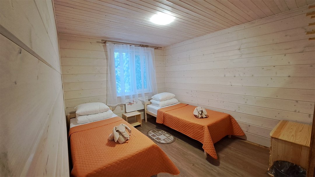 Двухэтажный коттедж с собственной сауной для комфортного отдыха большой семьёй или дружеской компанией. Первый этаж каждого коттеджа разделён на кухонную зону и зону сауны, второй этаж отведён под три отдельные спальные комнаты. Рядом с домиком находится мангальная зона, где есть мангал и стол со скамейками. В оснащение каждого коттеджа входит: Первый этаж - гостинная (основная зона отдыха, где располагается стол со стульями и камин); - мини-кухня (включает холодильник, чайник, микроволновую печь, посуду); - санузел (душевая кабина, туалет, раковина, фен, комплект полотенец); - сауна на дровах. Второй этаж - первая спальня: две двуспальные кровати, одно односпальное кресло-кровать, комод для хранения вещей; - вторая спальня: две односпальные кровати, комод для хранения вещей; - третья спальня: две односпальные кровати, комод для хранения вещей.Услуги и удобства