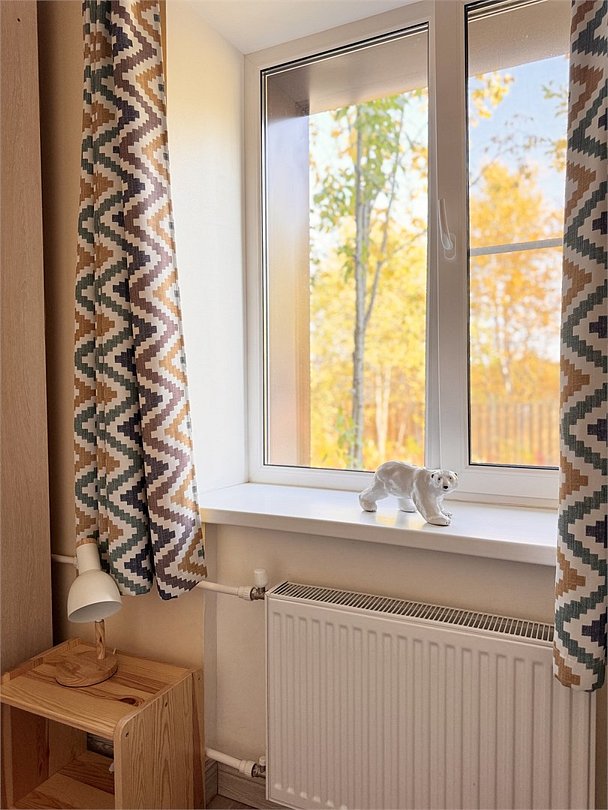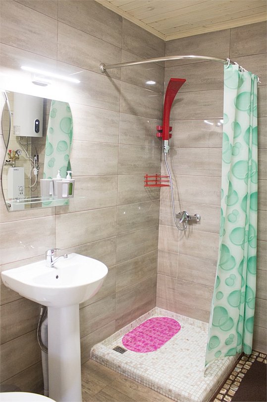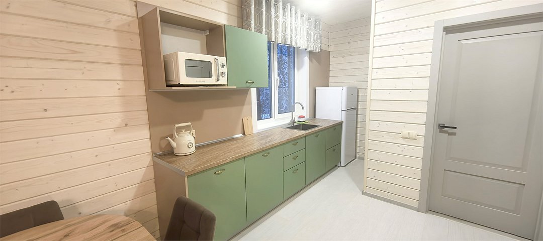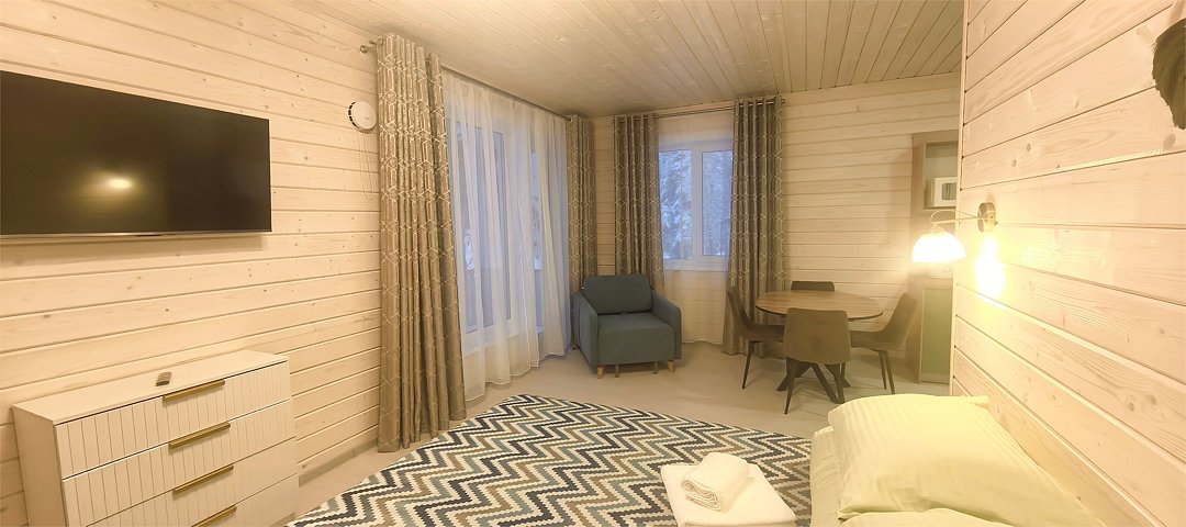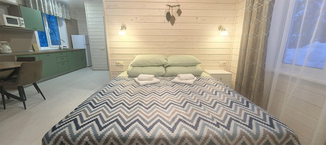 Комфортный и тёплый эко-дом, размещённый в уютном уединении. Специально для тех, кто хочет остаться один на один с природой. Домик построены из экологически чистого материала, хорошо отапливается, есть горячее водоснабжение. В домике есть ванная комната с душем и бесплатными туалетно-косметическими принадлежностями. Площадь 36 м2, рассчитан на комфортное размещение до 3 человек. Домик оборудован: - двуспальной кроватью-трансформером (при желании их можно превратить в две односпальные кровати); - одним односпальным раскладывающимся диваном; - журнальным столиком; - комодом и вешалкой для одежды; - миникухней (включает холодильник, чайник, микроволновую печь, посуду, настенный шкафчик); - ванной комнатой (включает душевую кабину, санузел, раковину, фен, полотенца); - открытой террасой со столиком и стульями. Рядом с домиком находится мангальная зона, где есть мангал и стол со скамейками.Услуги и удобства