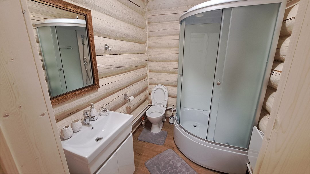 кондиционер, светильник, настольные лампы, фен, ванная комната, душевая кабина, санузел, водонагреватель, теплый пол, банные принадлежности, банные полотенца, тапочки, терраса, две односпальные или большая двуспальная кровать, стулья, вешалки, журнальный столик, зеркало, комод, ковер, чайный набор, набор посуды, чайник, унитаз, раковина, питьевая вода, отопление, ламинат, стаканы, столовые приборы, стол, туалет, теплые полы, вид на лес, фумигатор, бутилированная вода, без питомцевВ коттедже