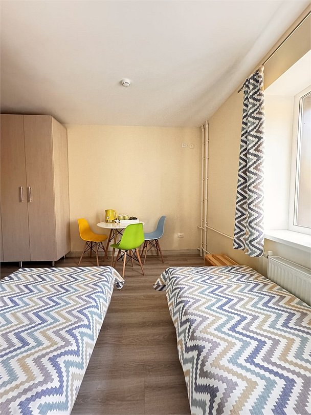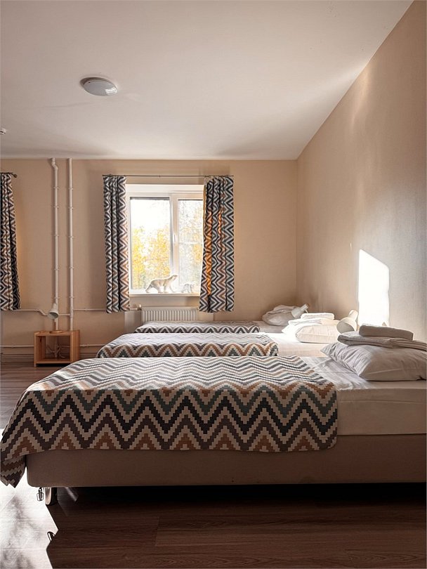 Номер фонд состоит из 2-х местных, 3-х местных и 4-х местных номеров. На каждом из 3-х этажей гостиницы имеется общая холл-зона с ТВ и досуговой зоной, а также бесплатный WI-FI. Номерной фонд оборудован: - кроватями системы трансформер TWIN/DBL; - ортопедическим матрацем с постельными принадлежностями; - шкафом и вешалкой для одежды; - журнальным столиком со стульями; - тумбочкой со светильником; - электрическим чайником и набором чайной посуды; - туалетной комнатой (раковина, санузел, фен, большое зеркало, гигиенические средства); - душевой комнатой (полноценная душевая, сушилка для белья, полотенца, коврик для ног, косметические средства, тапочки).Услуги и удобства