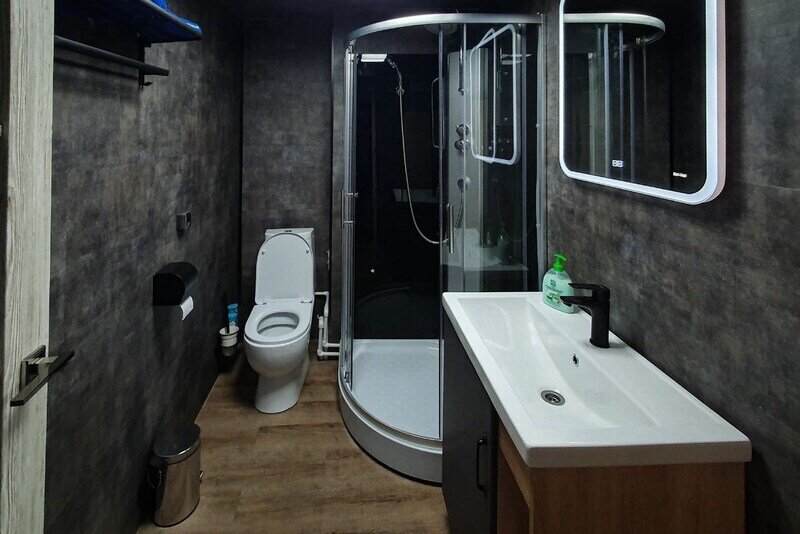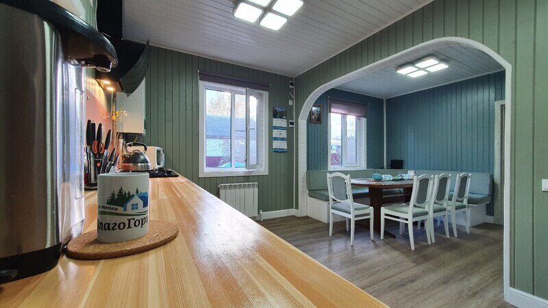 В коттедже 2 жилых этажа. На первом этаже расположена большая кухня-столовая, (кухня оборудована всей необходимой и новейшей техникой: два двухкамерных холодильника, газовая плита, микроволновая печь, духовой шкаф, вытяжка, чайник, термопод, вся необходимая посуда на 10 персон), общей площадью 25 кв.м., две спальни, совмещенный санузел, гостиная 60кв.м., для работы, отдыха и просмотра фильмов. (оборудована: TV LG-4K 82, возможность подключения караоке, X-BOX, данное помещение может быть оборудовано под офис).