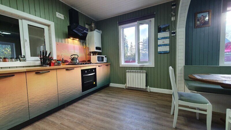Коттедж с авторским ремонтом, на участке 12 соток. На территории также находится зона Патио у дома, обустроено место для комфортного приготовления еды, в которую входит: мангал, дрова, решетки, шампуры. В темное время суток участок хорошо освещен. Имеется парковка на 8 машиномест.