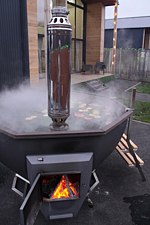 Чан топится дровами 4-6 часов, в зависимости от погодных условий. Температура воды в подготовленном чане 38-42 градуса. Одна топка держит тепло от 2 часов, оставляется вязанка дров для поддержания температуры воды.