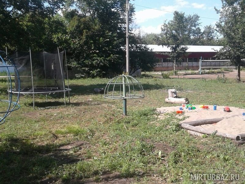 На территории расположена детская площадка и батут.