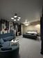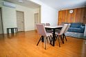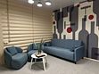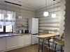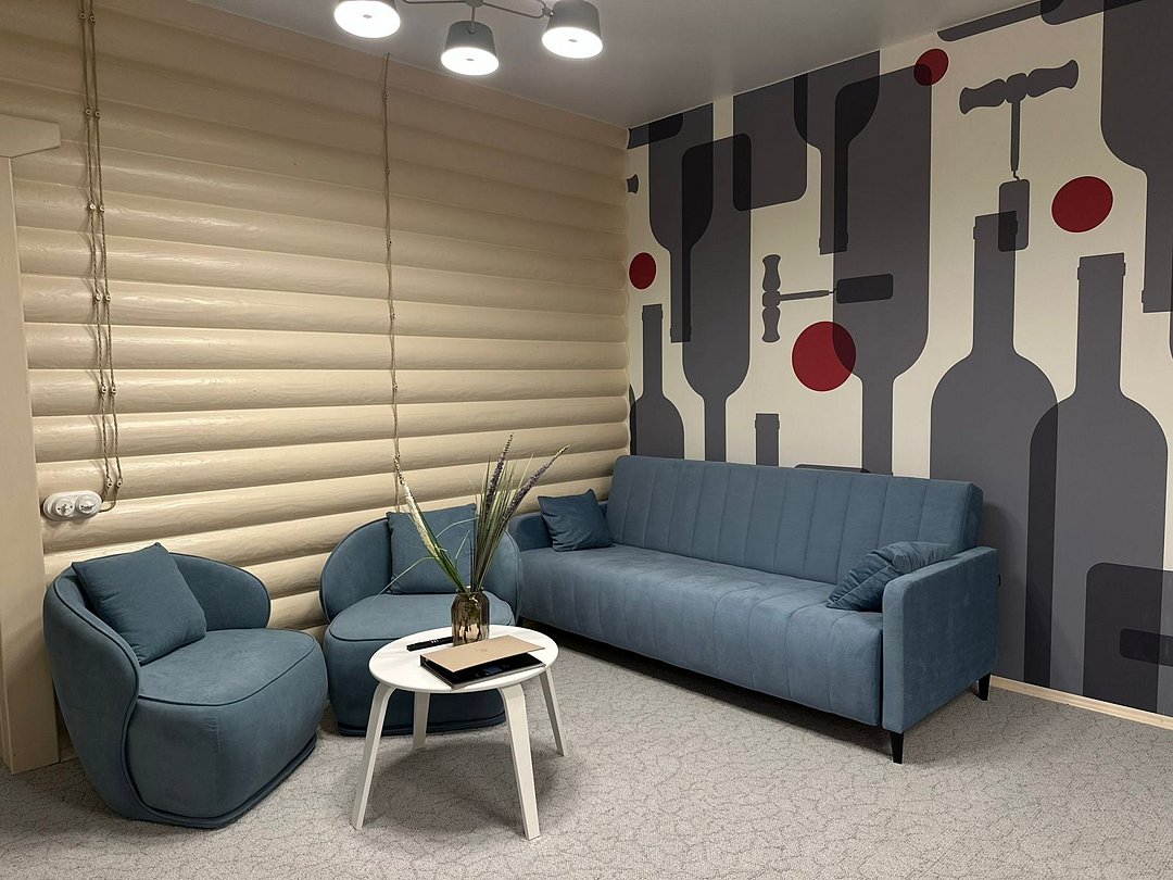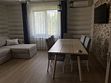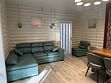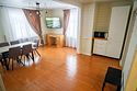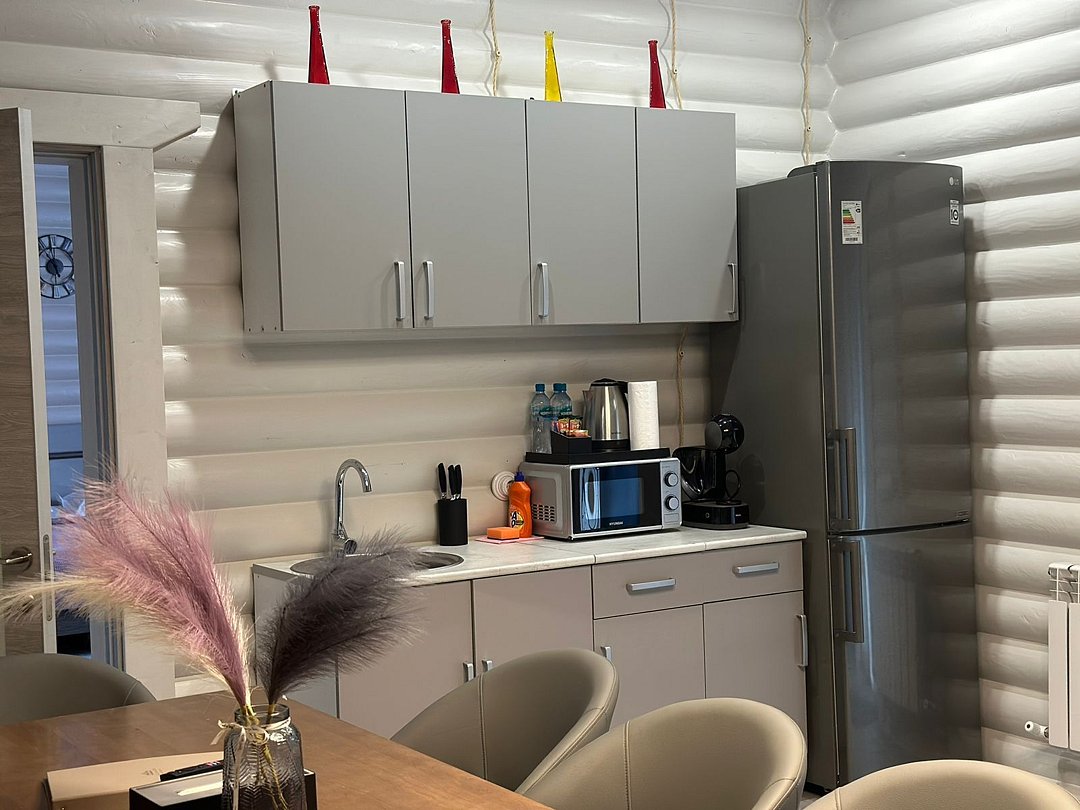 Большая гостиная с мягким диваном и креслом, большой обеденный стол с креслами, мини-кухня с электрочайником, микроволновой печкой и большим двухкамерным холодильником.