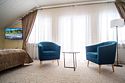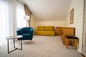 Комфортное размещение с двуспальной кроватью, туалетным столиком и вместительным шкафом. Имеется просторный диван, трансформирующийся в дополнительные спальные места, а также удобные кресла и журнальный столик в зоне с телевизором и спутниковыми каналами.