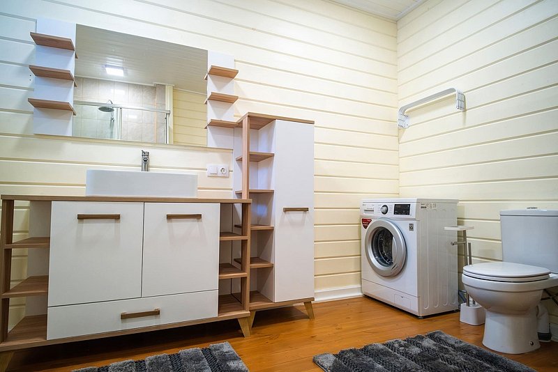 В состав дома входит 4 кровати 0,8*2м, кухонный гарнитур с посудой на 4 персоны. Туалетная комната имеет нагревательный электробойлер, душевой поддон и унитаз.