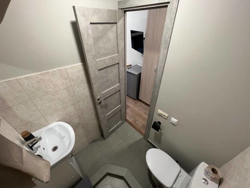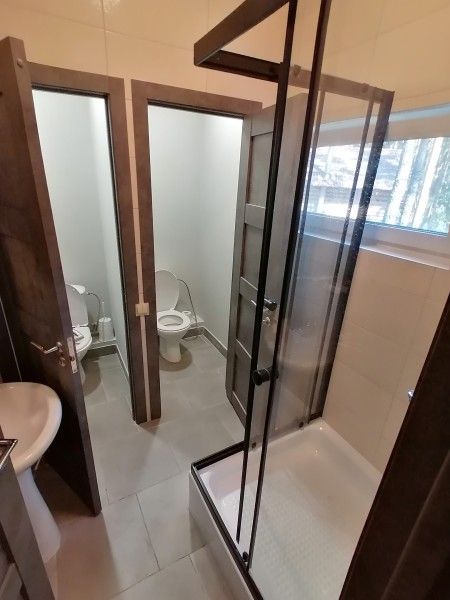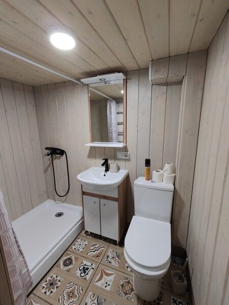 - Собственный санузел с плиточным душ-поддоном, туалетом, раковиной, жидким мылом и туалетными принадлежностями