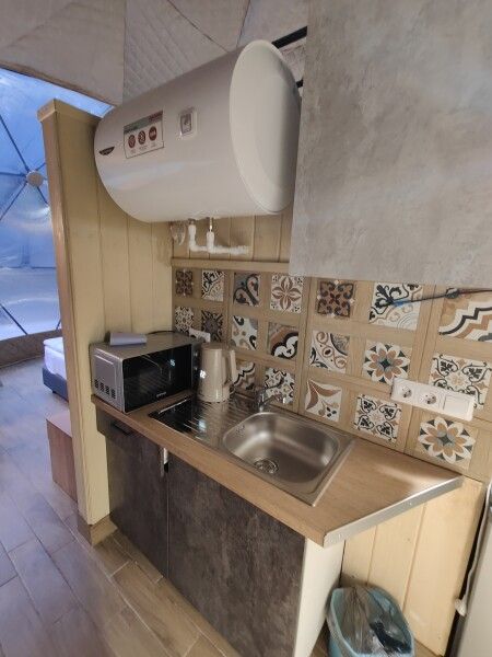 Кухня (электрический чайник, посуда на 6 персон, шампура, кулер с питьевой водой, мини-холодильник, микроволновая печь).
