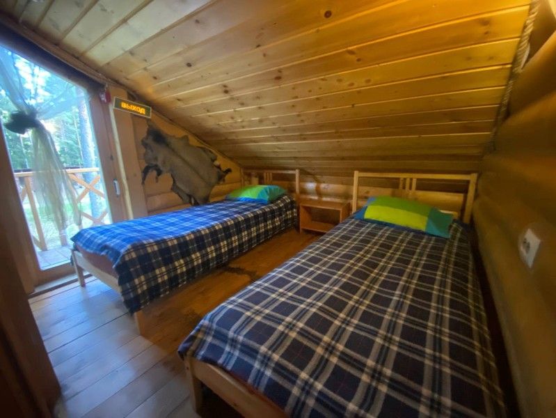 2 этаж: спальня (две односпальных кровати из массива сосны), мини-балкон со спуском во двор.