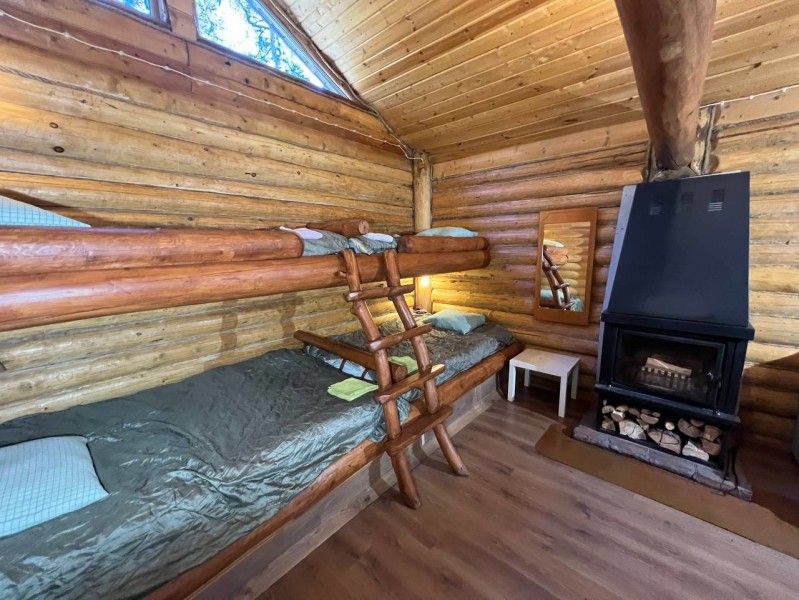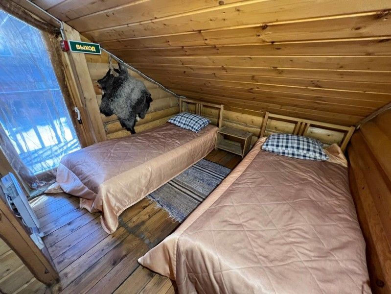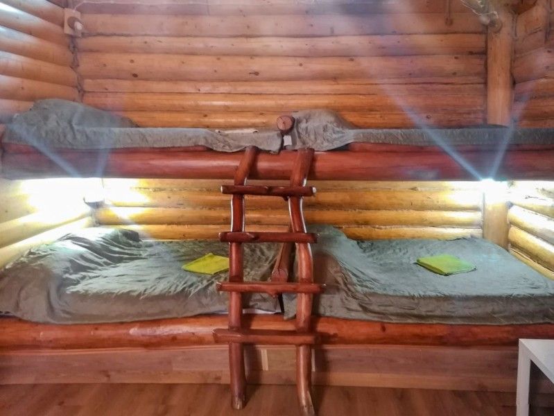 Две большие двуспальные кровати из массива сосны, над ними две односпальные.