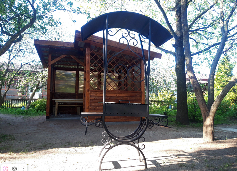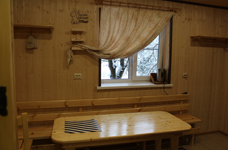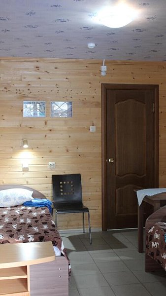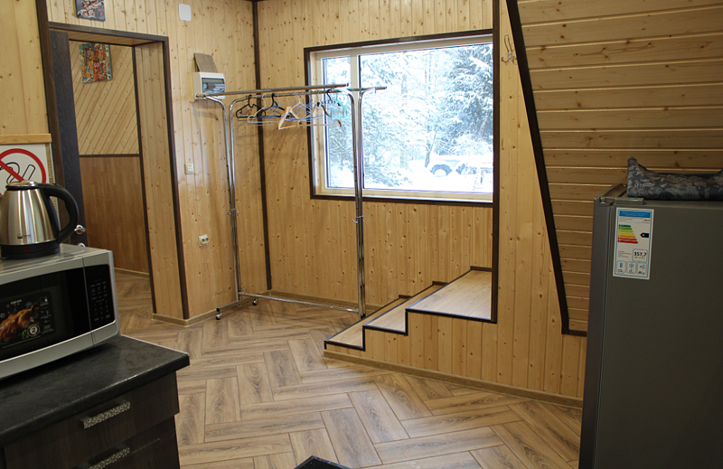 В номере санузел с душем, чайник, холодильник, стол, стулья, шкаф. Отдельный выход из номера ведёт на общую кухню и в помещения сауны. Перед входом в номере свой мангал под навесом и терраса.
