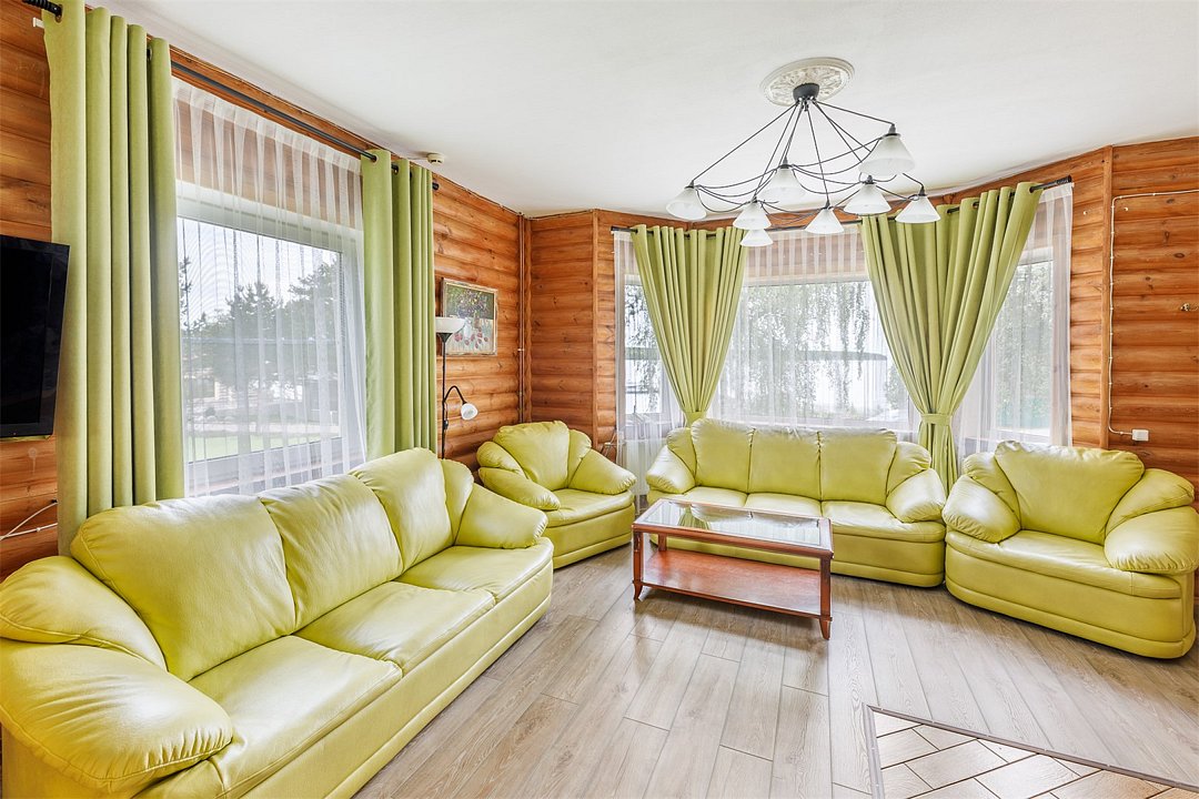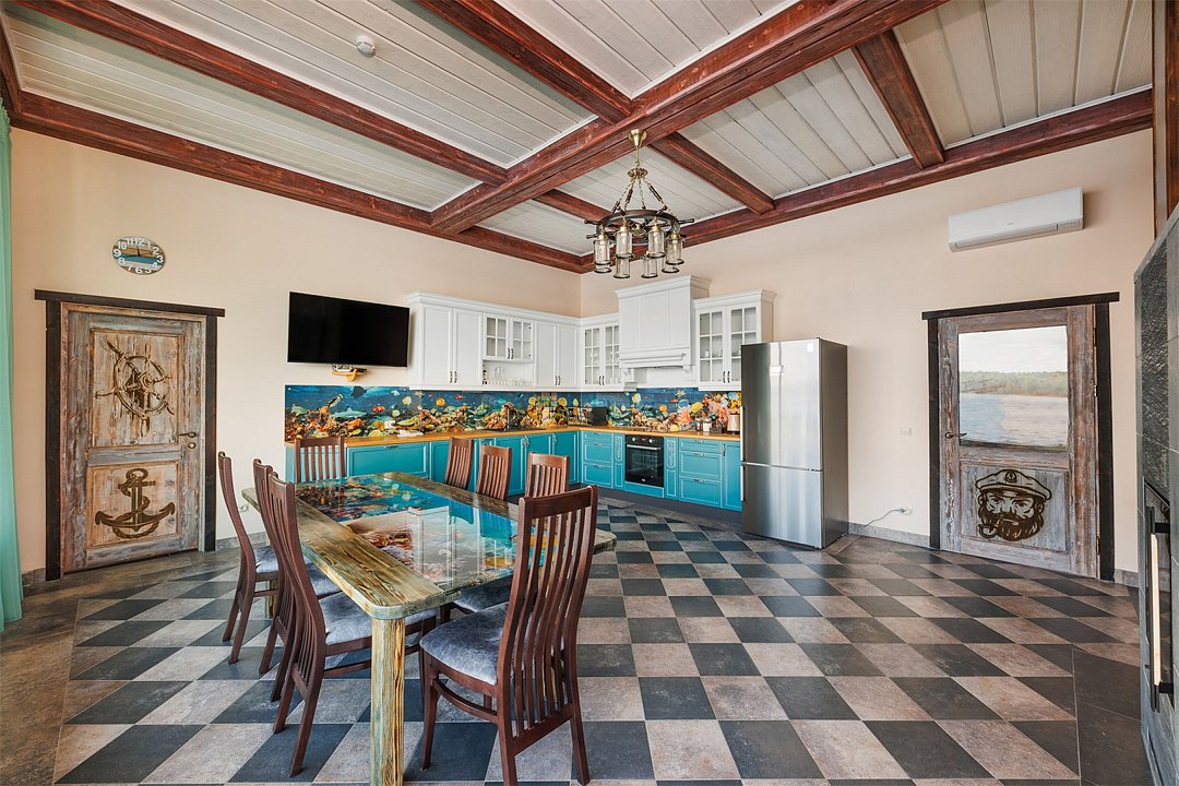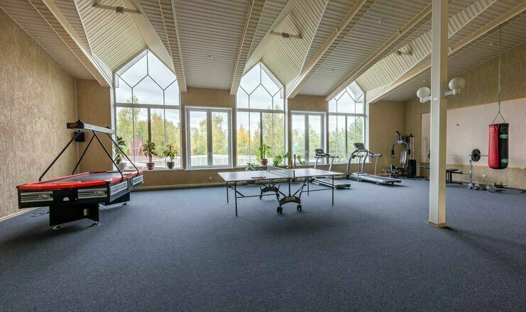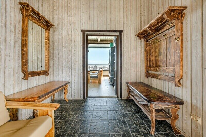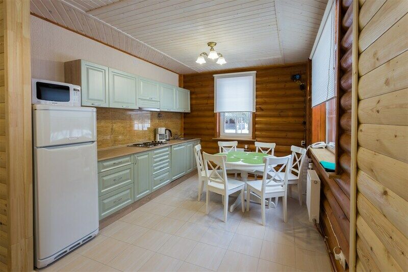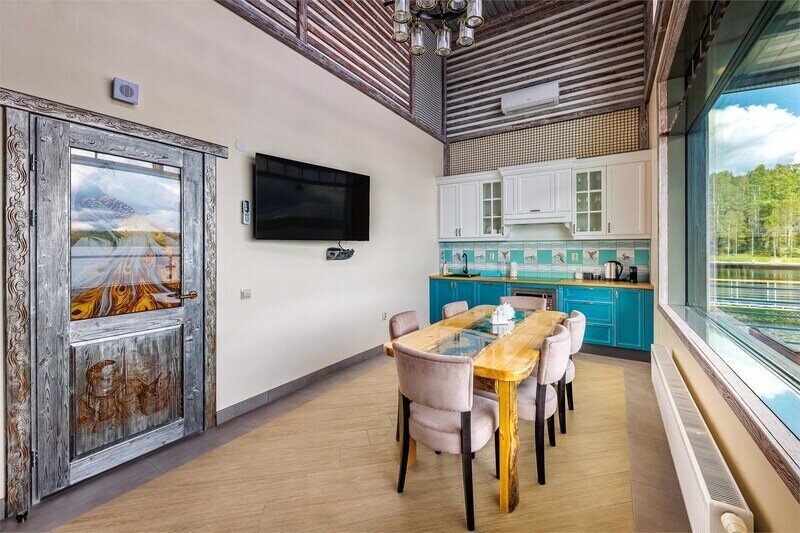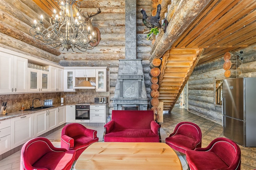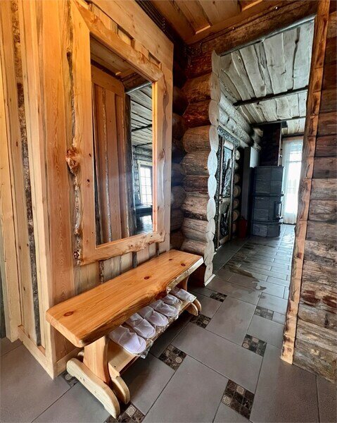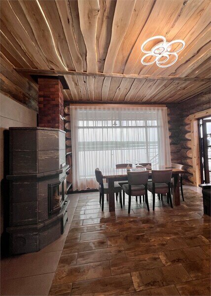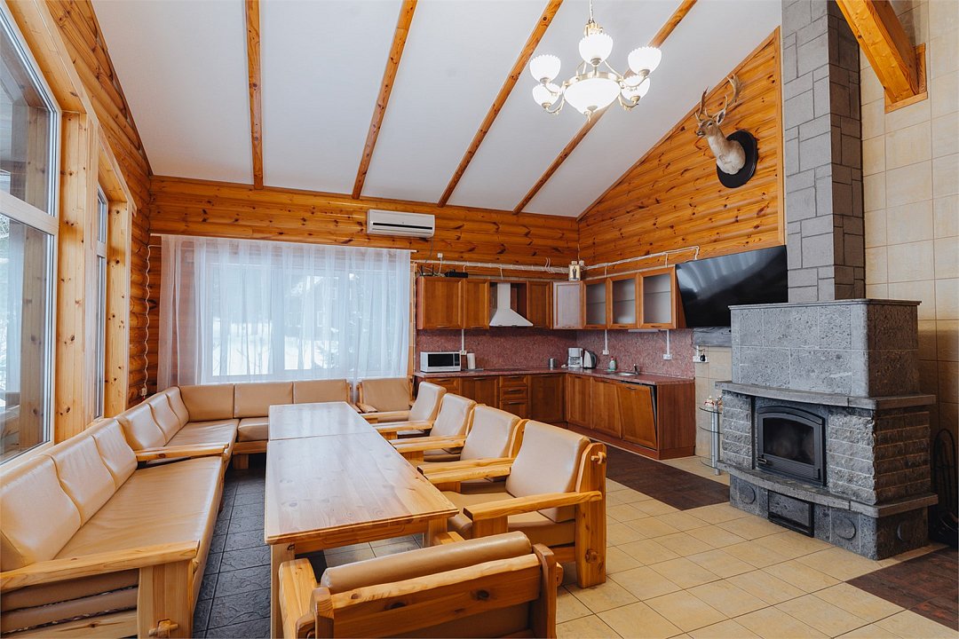 На первом этаже: гостиная, камин, телевизор, душевая, мини-бар (платно), холодная купель. На втором этаже: русская парная на дровах. Рядом с баней имеется мангальная площадка, пирс, выход к озеру. Вместимость до 10 гостей