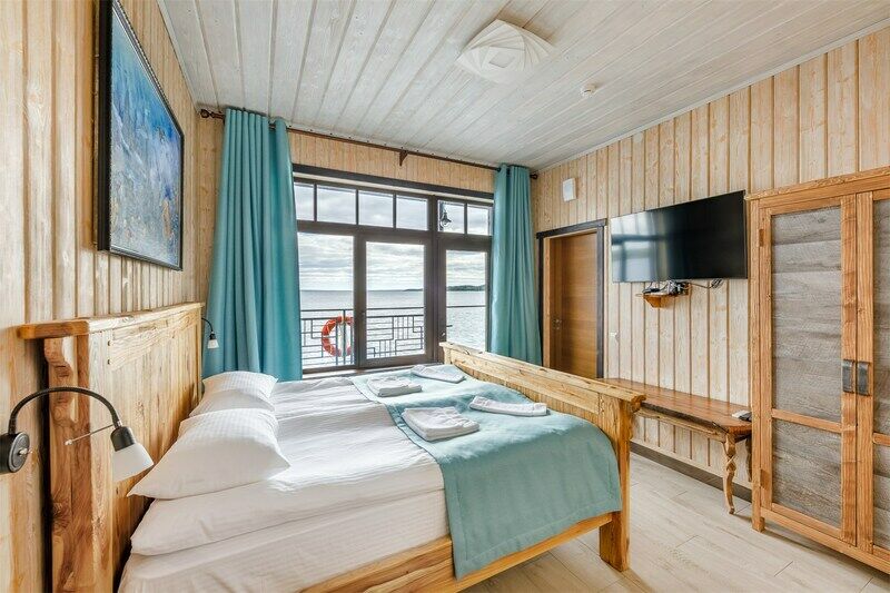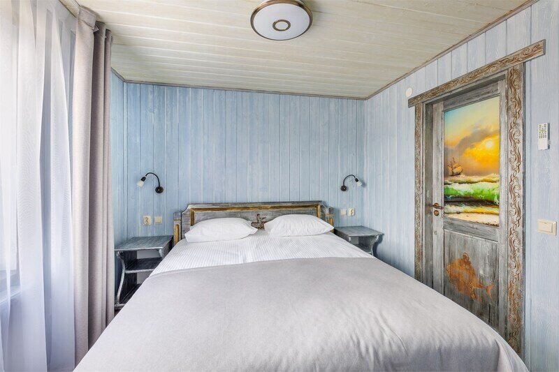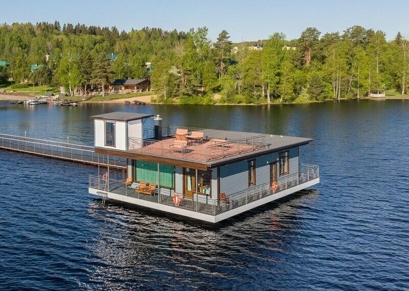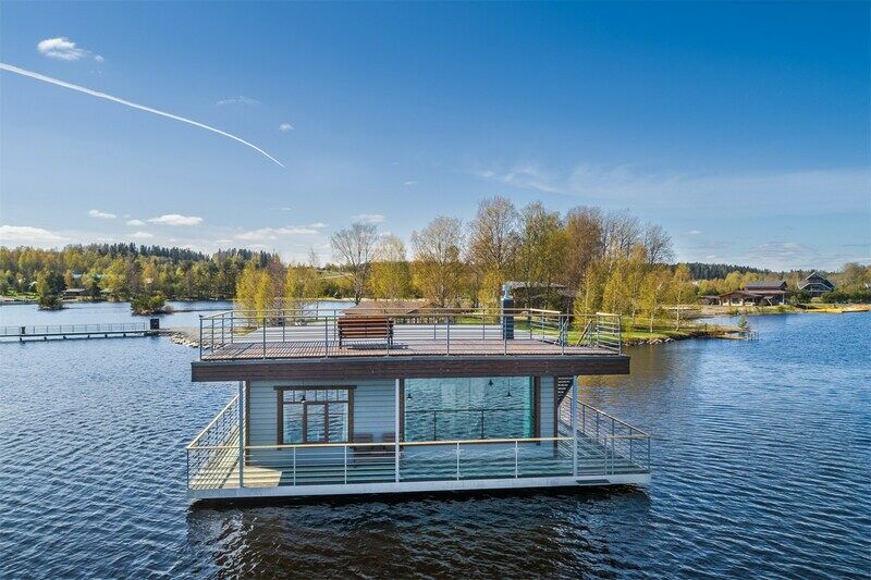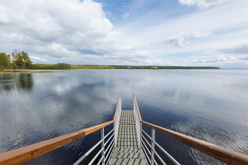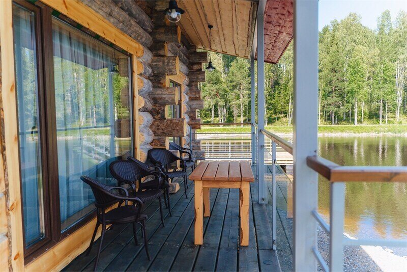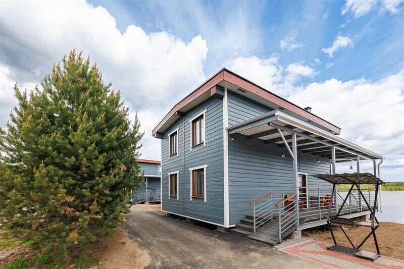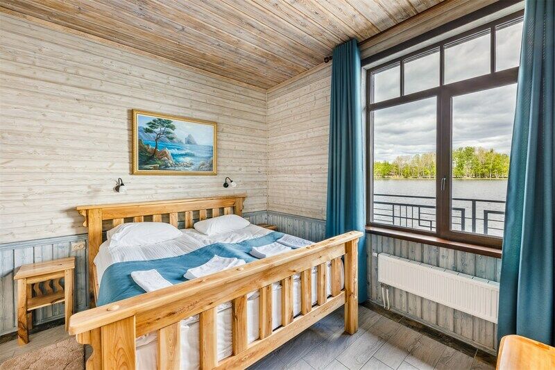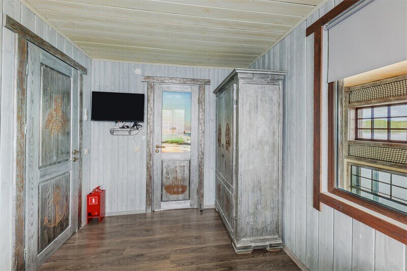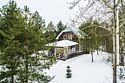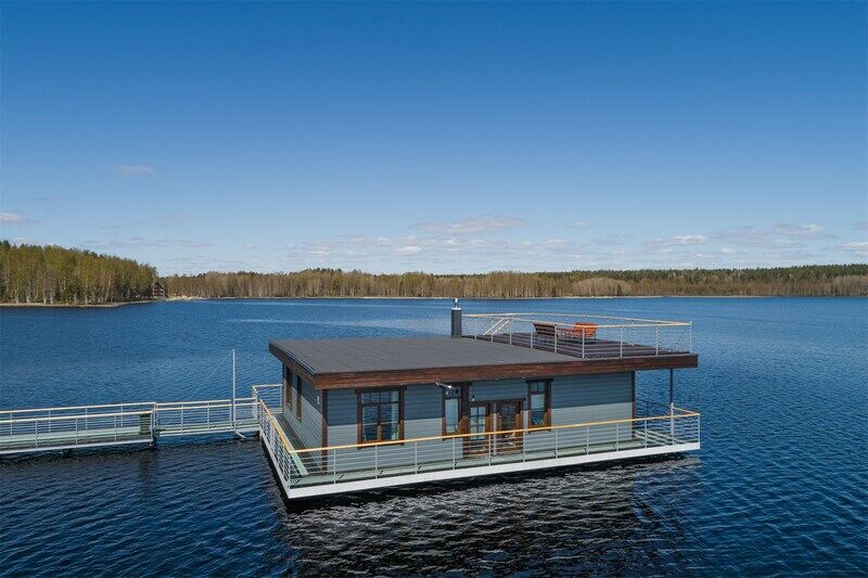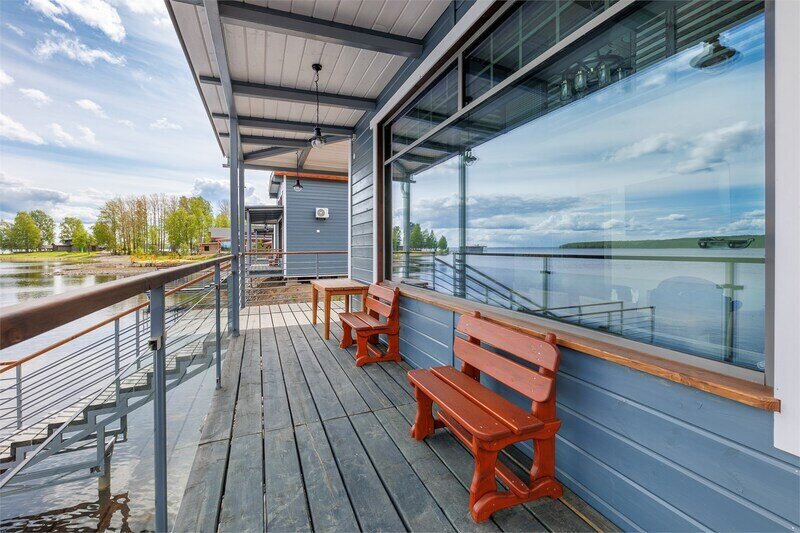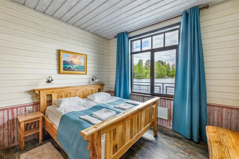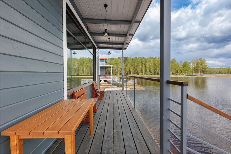 6 местный хаусбот на мысу. Одноэтажный деревянный коттедж с тремя спальнями (в каждой спальне есть туалет и душ), гостиная с камином и оборудованной кухней, две сауны: инфракрасная и финская, терраса на крыше. Рядом с коттеджем имеется мангальная зона.