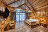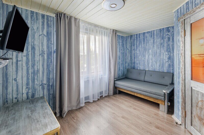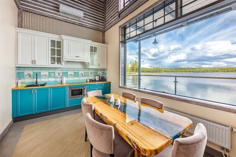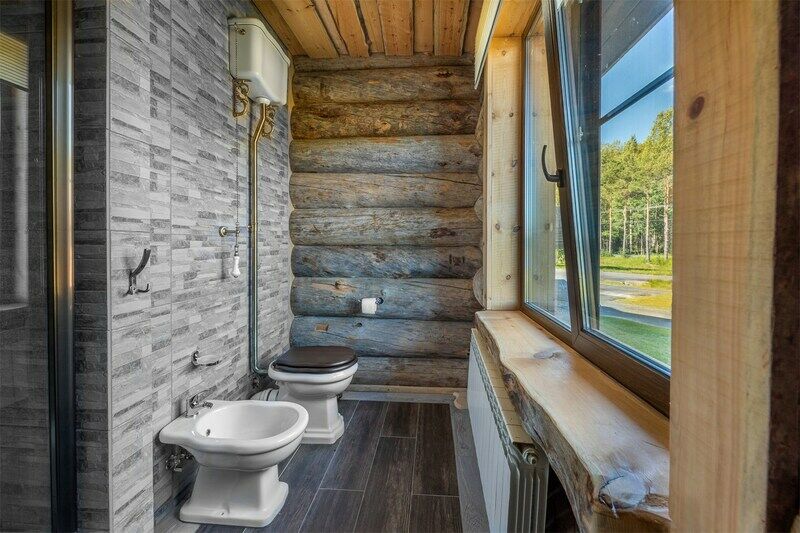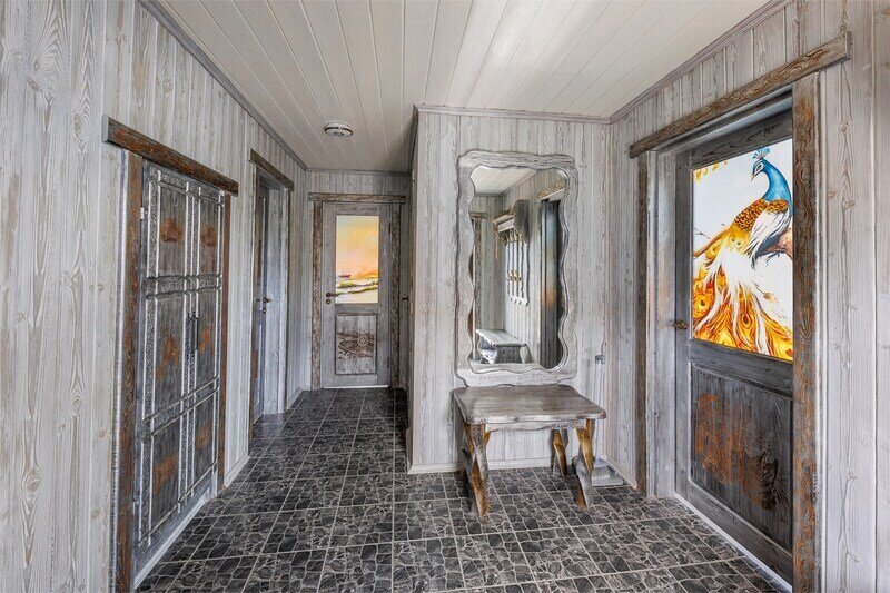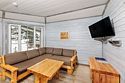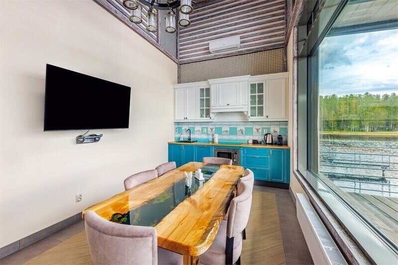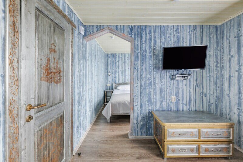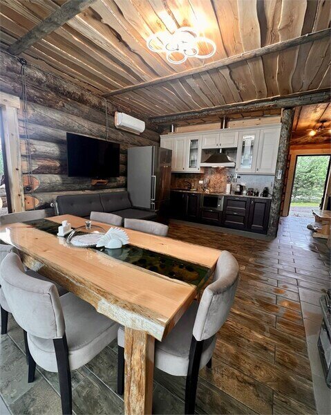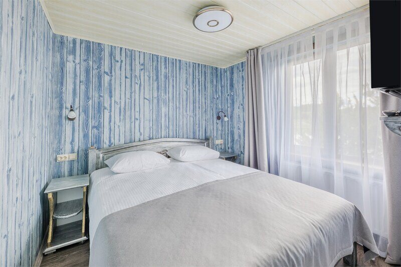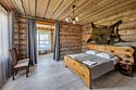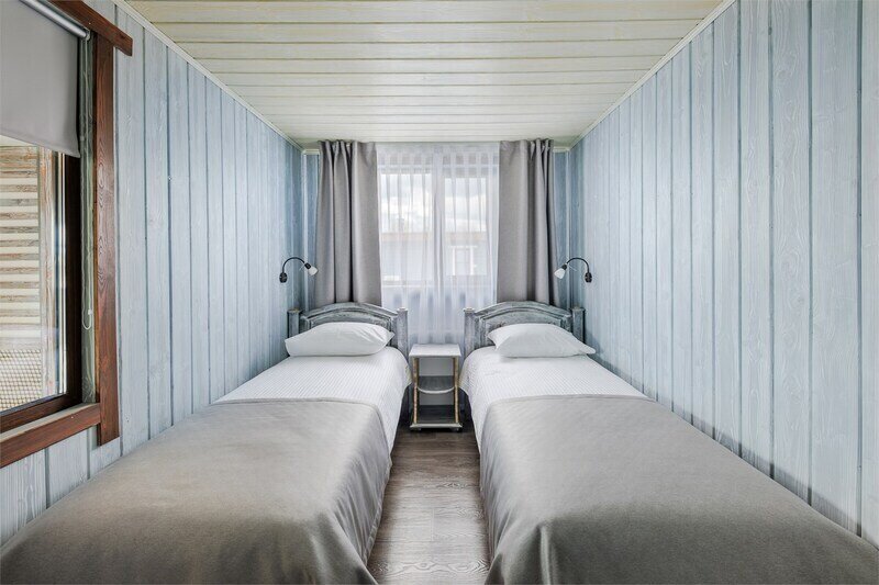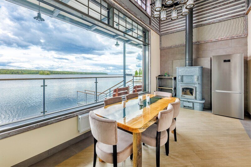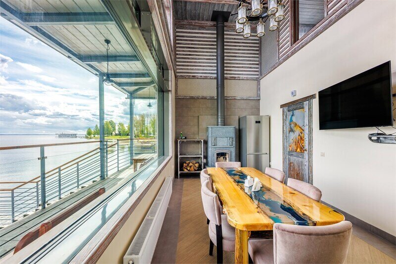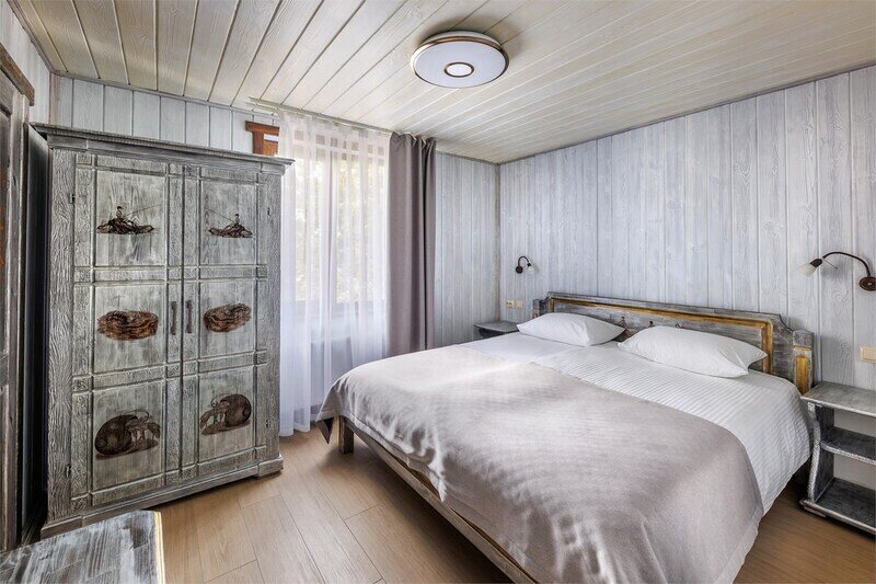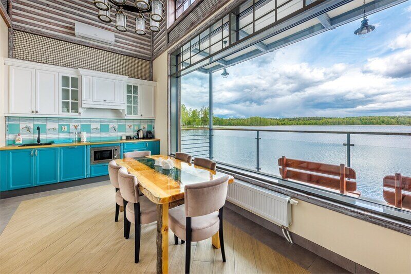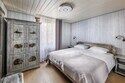 6 местный хаусбот на мысу. Одноэтажный деревянный коттедж с тремя спальнями (в каждой спальне есть туалет и душ), гостиная с камином и оборудованной кухней, две сауны: инфракрасная и финская, терраса на крыше. Рядом с коттеджем имеется мангальная зона.
