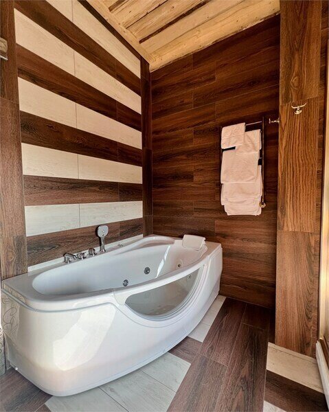 Удобства: душ, туалет, фен, биде, полы с подогревом, полотенца, тапочки, халаты, косметический набор (гель для душа, шампунь, кондиционер, бальзам для тела, зубной набор, ватные диски/палочки, шапочка для душа).