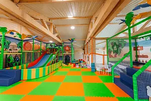 Пространство с батутом, скалодромом, механической каруселью, горками с сухим бассейном. Есть отдельный сухой бассейн для малышей и мягкий конструктор. Посещение входит в стоимость проживания (под присмотром родителей). А ещё здесь проводится множество полезных, развивающих и познавательных занятий: