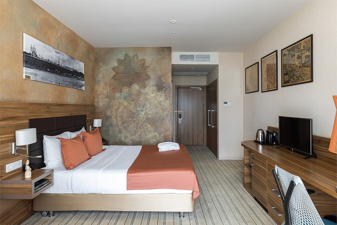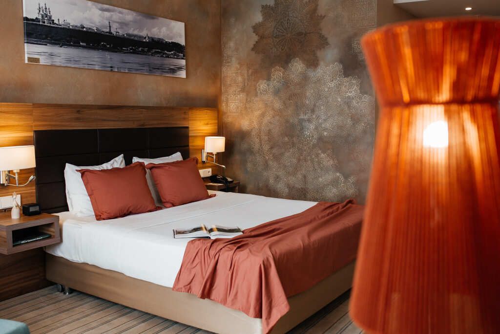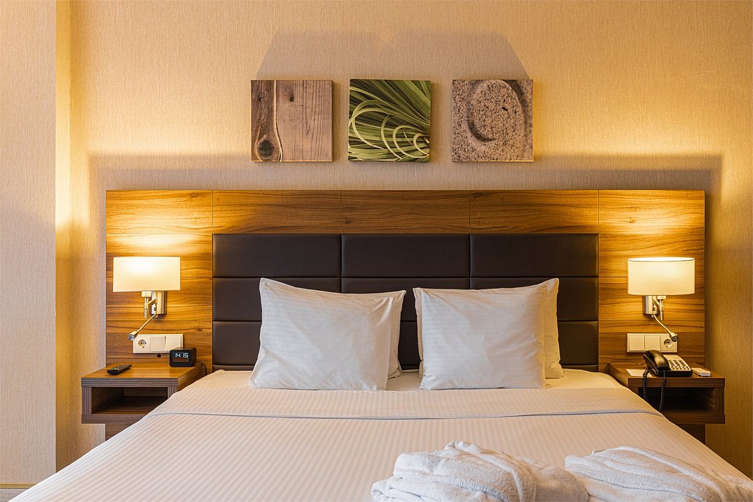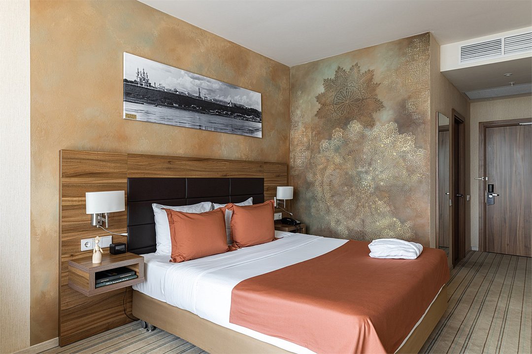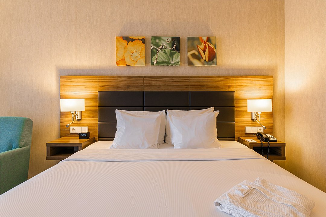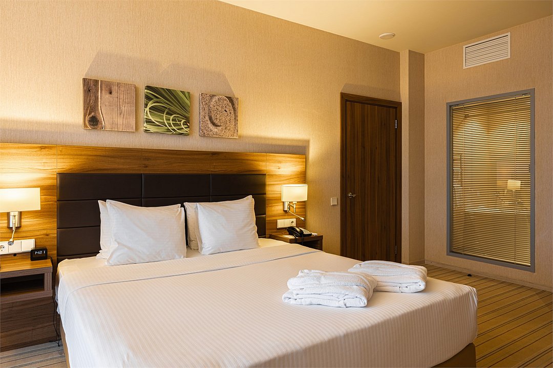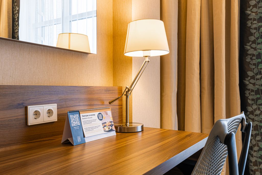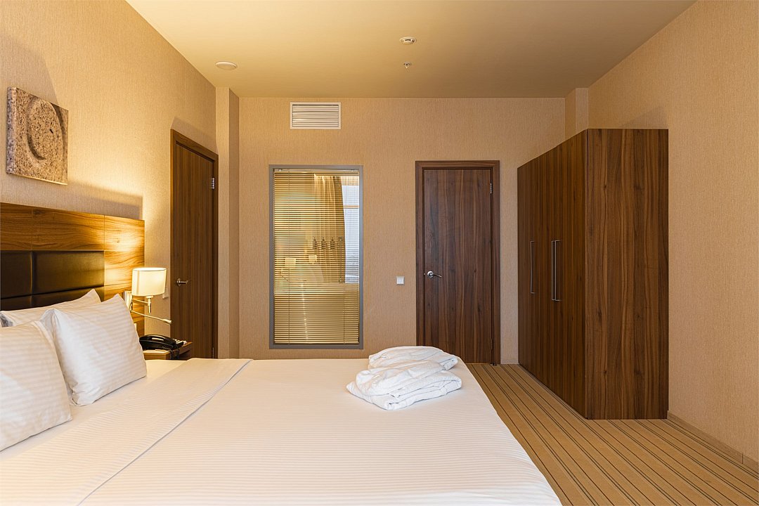 Отличный номер класса комфорт 1-ой категории с двуспальной кроватью. В номере есть всё для комфортного отдыха как одного гостя, так и при проживании вдвоём: большая кровать Suite Dreams® by Serta, ЖК-телевизор с диагональю 32 дюйма, беспроводной интернет, мини-бар, кофемашина, кондиционер. Кроме того, вы по достоинству оцените великолепный обзорный вид на город, открывающийся из панорамных окон. Для тех, кто ценит домашнюю атмосферу, в распоряжении есть всё необходимое: халат, тапочки, набор мини-косметики, чайные и кофейные принадлежности, графин для наполнения водой из кулера, утюг и гладильная доска. Для удалённой работы в номере есть удобный стол и эргономичный стул, а в отеле функционирует круглосуточный бизнес-центр, предоставляющий бесплатные услуги печати и копирования. Кроме того, наш отель располагает смежными номерами, которые соединяются друг с другом общей дверью, что может обеспечить семьям с детьми более комфортное и удобное проживание.Услуги и удобства