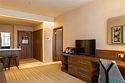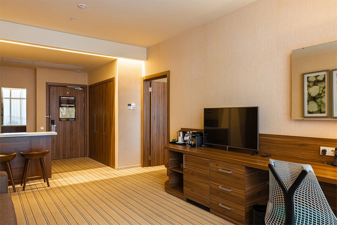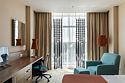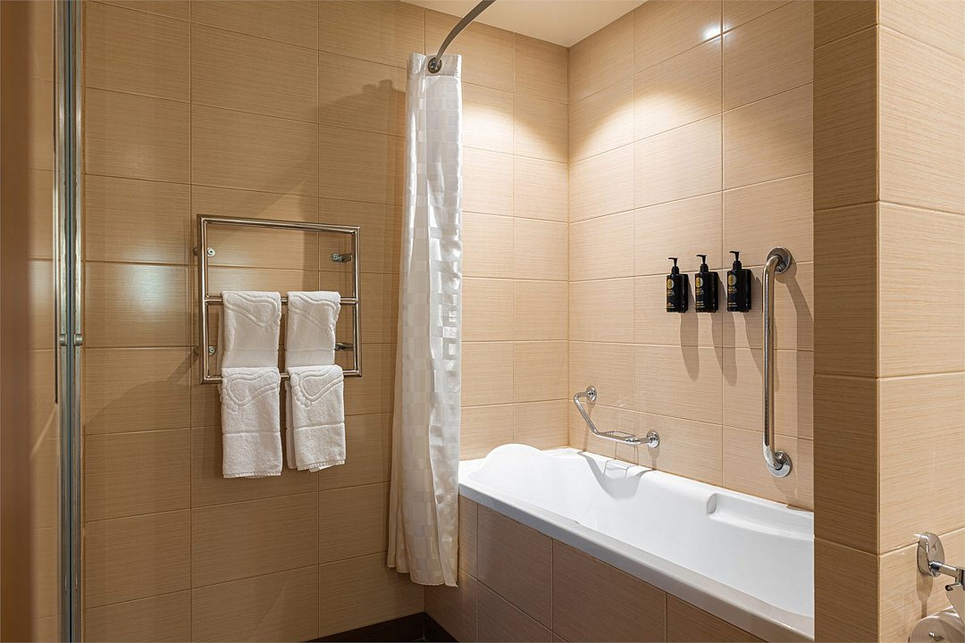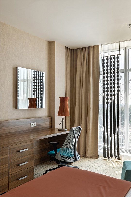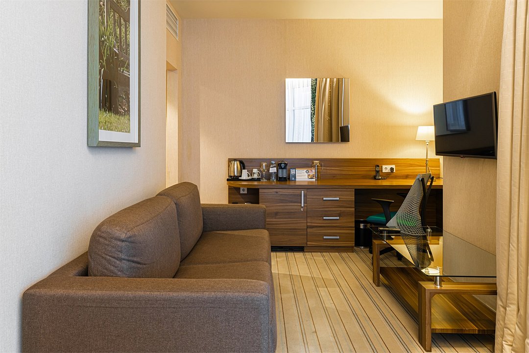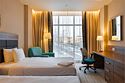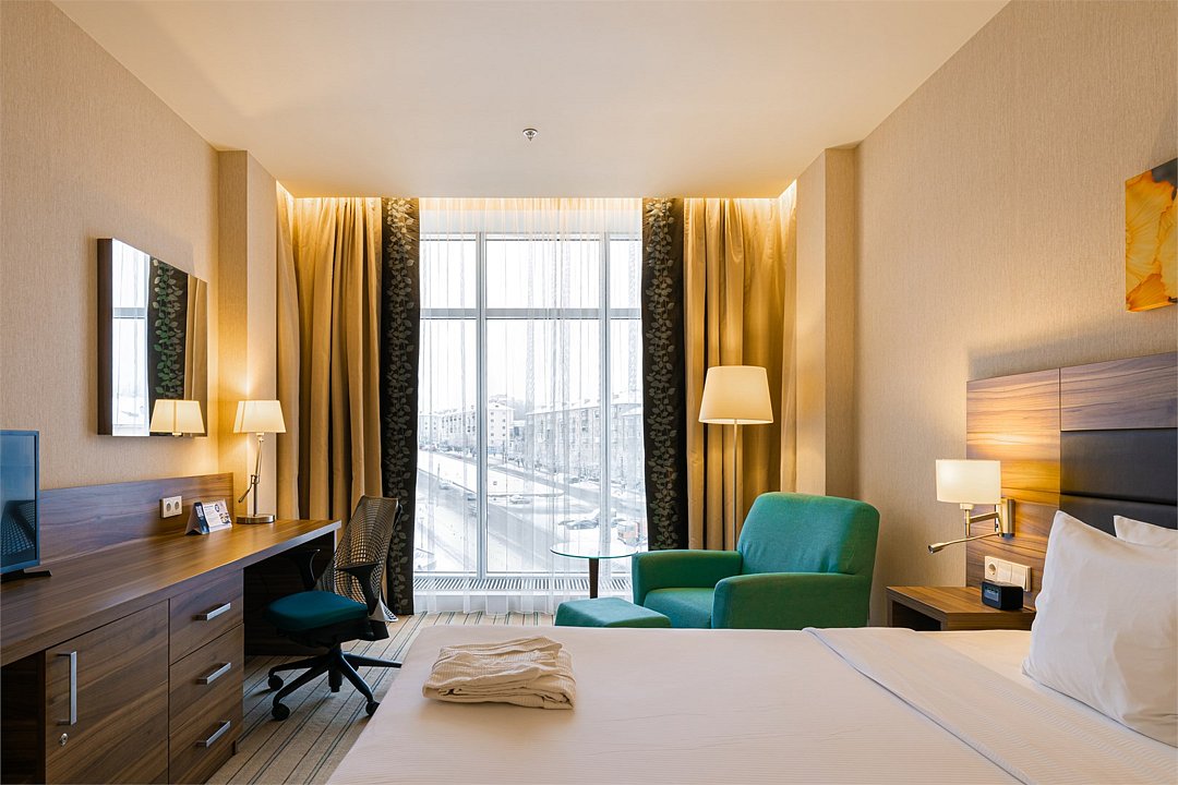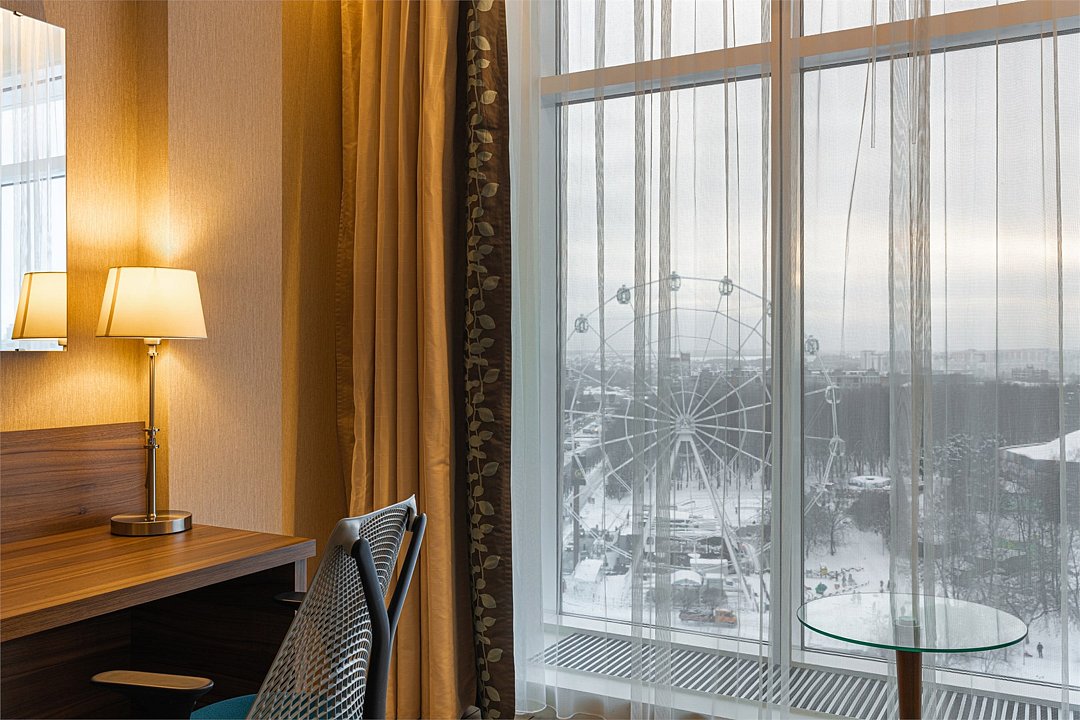 Люкс с панорамным видом располагает спальней с большой кроватью, гостиной и живописным видом из окна на колесо обозрения, городской парк и пруд. Номер идеально подойдет для длительной командировки, долгожданного путешествия или романтичного уикенда. В вашем распоряжении на 35 кв.м. роскошная кровать размера «king size» Suite Dreams® by Serta, отдельная гостиная с раскладным диваном-кроватью, просторная рабочая зона со столом и эргономичным стулом. Номер полностью укомплектован в соответствии со стандартами 5*: два ЖК-телевизора с диагональю 42 дюйма и бесплатным доступом к беспроводному Интернету, мини-бар, кофемашина, набор посуды, кондиционер, чайные и кофейные принадлежности, утюг и гладильная доска. Также у вас есть возможность воспользоваться бесплатным посещением бассейна (5 мин от здания отеля) и услугами нашего круглосуточного бизнес-центра.Услуги и удобства