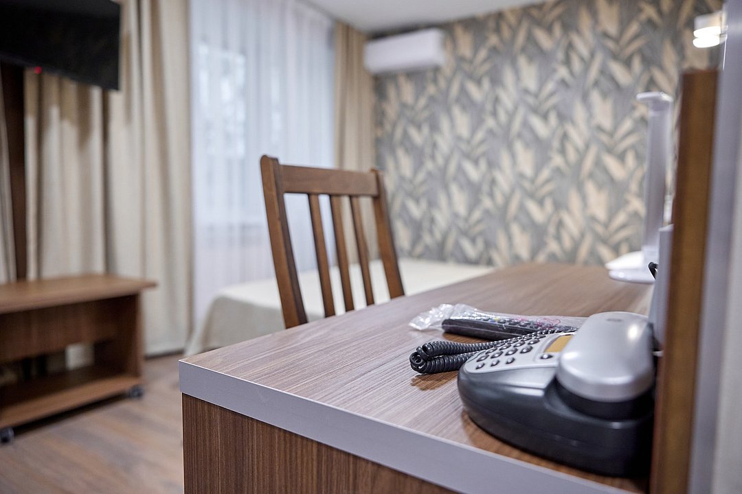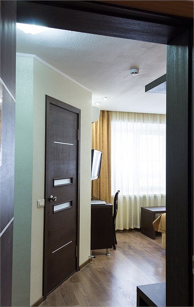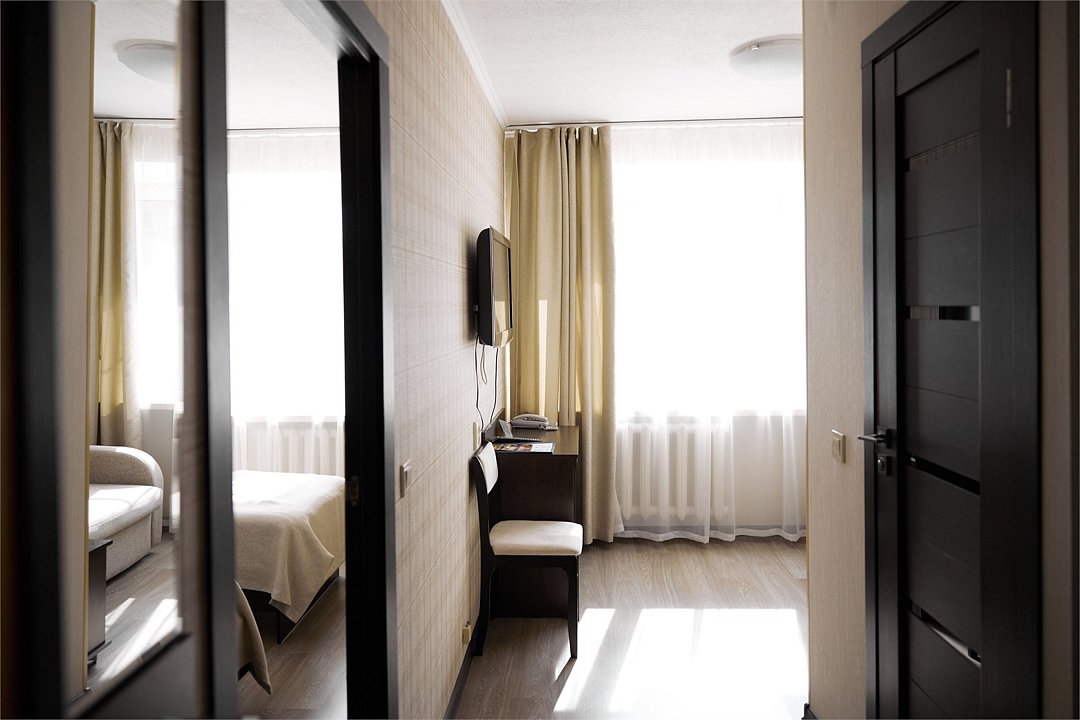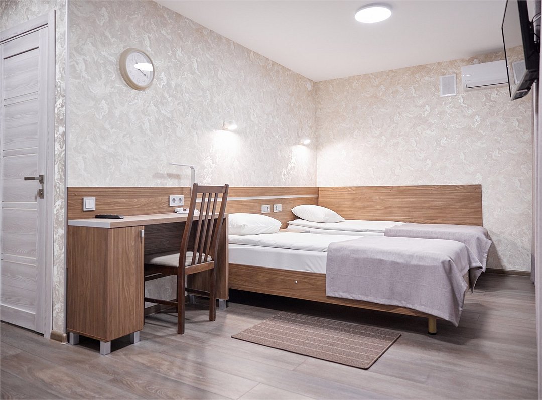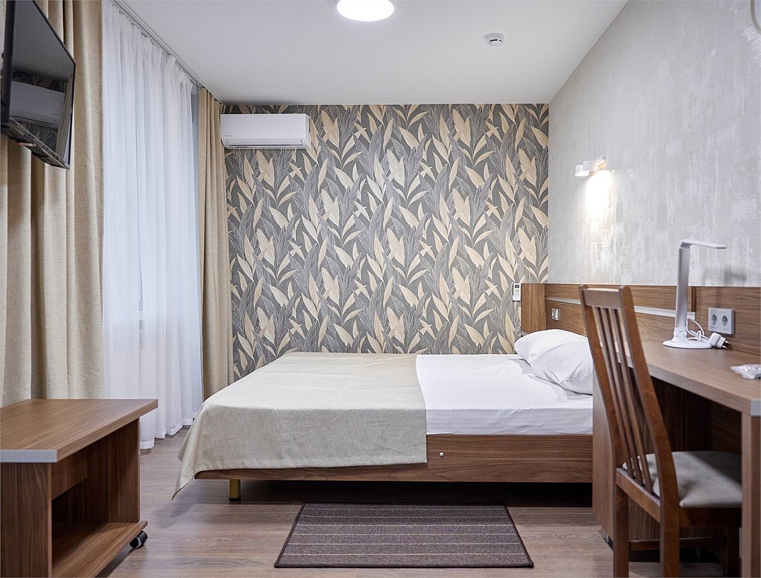 Просторные номера оформлены в спокойных тонах и предлагает всё необходимое для комфортного пребывания. Теплое освещение, современная мебель Оснащение номера: Кондиционер Телевизор Письменный стол Кровать Шкаф для одежды Ванная комната с душем Фен Полотенца и халатыУслуги и удобства