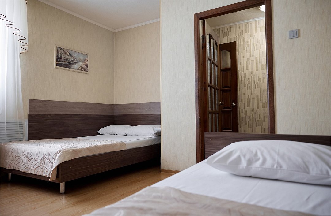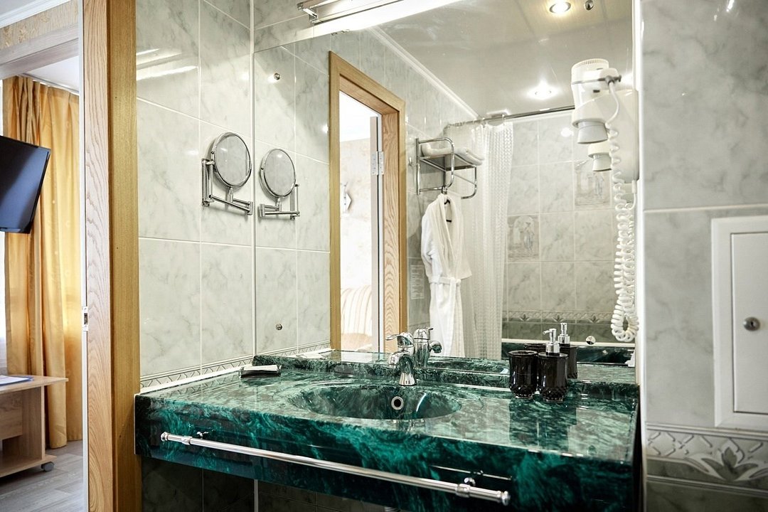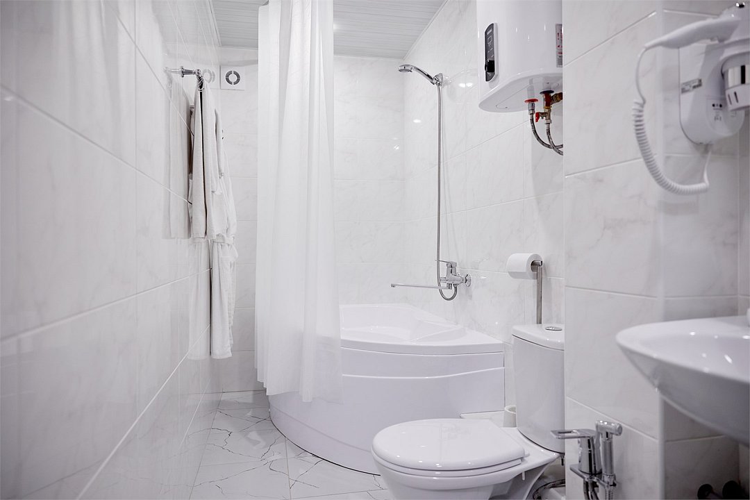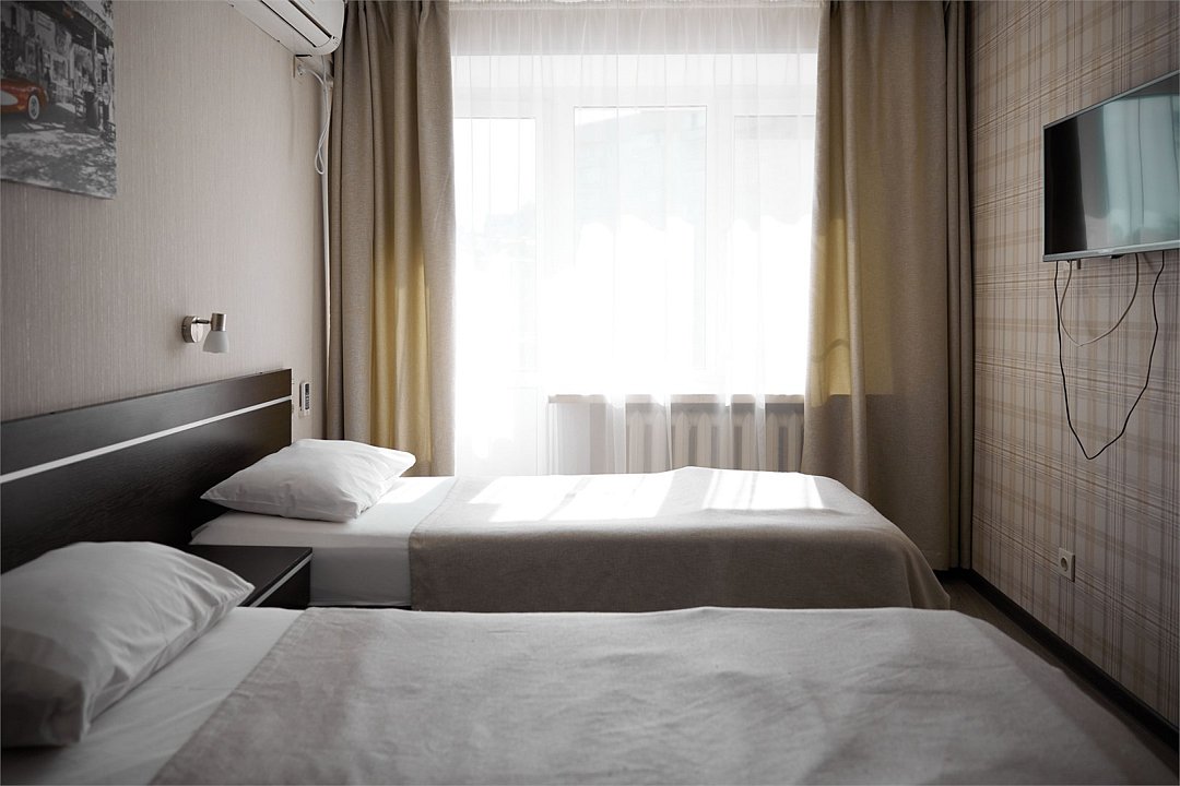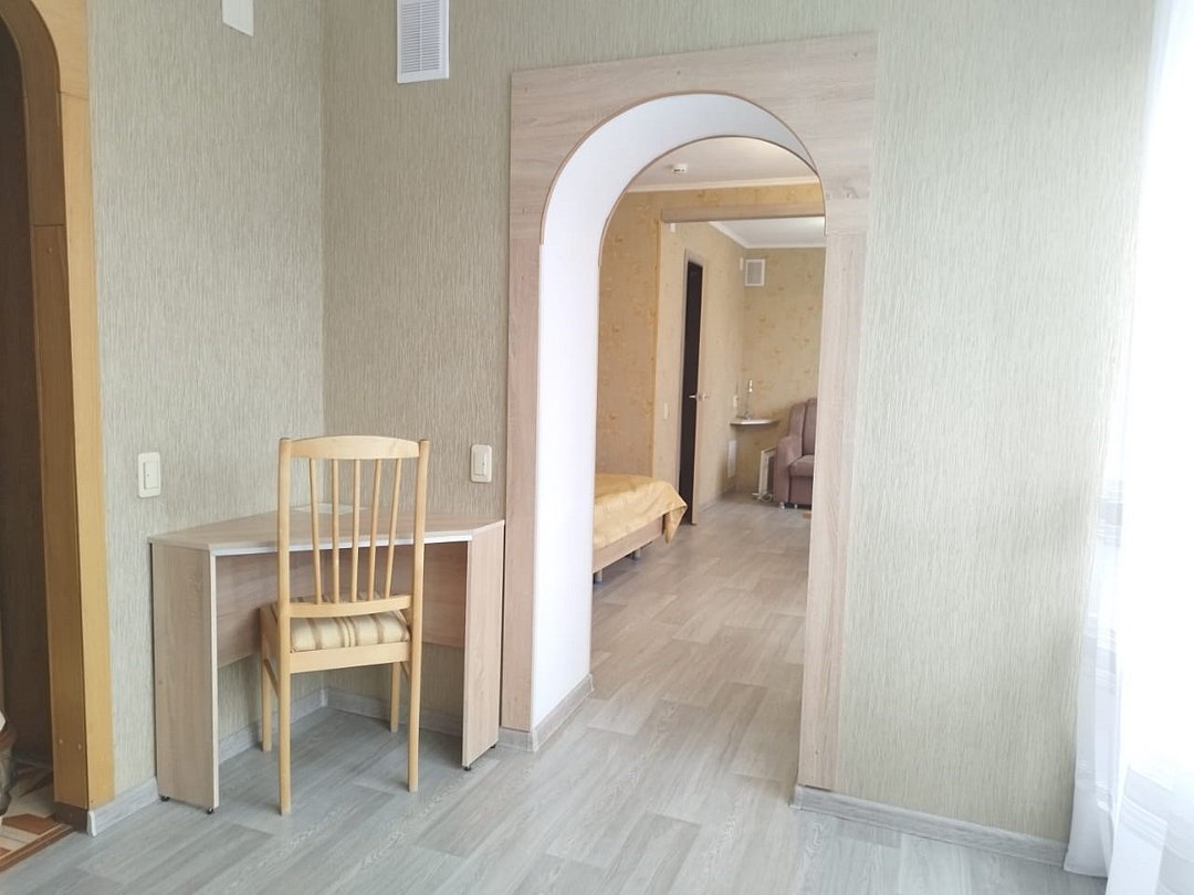 Просторные номера оформлены в спокойных тонах и предлагает всё необходимое для комфортного пребывания. Теплое освещение, современная мебель Оснащение номера: Кондиционер Телевизор Письменный стол Кровать Шкаф для одежды Ванная комната с душем Фен Полотенца и халатыУслуги и удобства