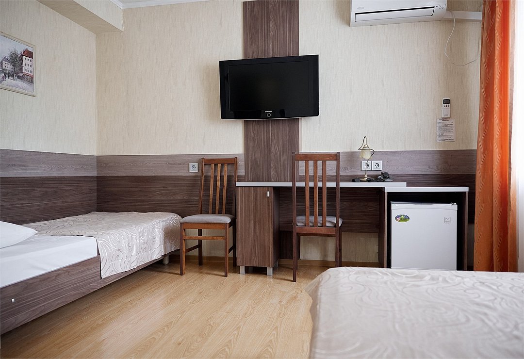 кабельное телевидение, Wi-Fi, телефон, кондиционер, фен, радио, обогреватель, водонагреватель, банные полотенца, гигиенические средства, две односпальные кровати, стулья, шкаф для одежды, журнальный столик, письменный стол, зеркало, унитаз, раковина, душ, мини-холодильник, можно с питомцамиВ номере
