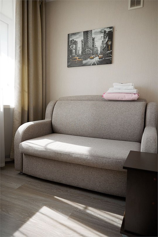 Уютный номер с современным интерьером. Светлый дизайн и функциональная планировка создают атмосферу комфорта и удобства. Светлая спальня с широкой кроватью и дополнительной зоной отдыха, а также стильная ванная комната с продуманными деталями. Оснащение номера: Двуспальная кровать Раскладной диван Телевизор Письменный стол с креслом Ванная комната с душем Фен Настенные бра и освещениеУслуги и удобства