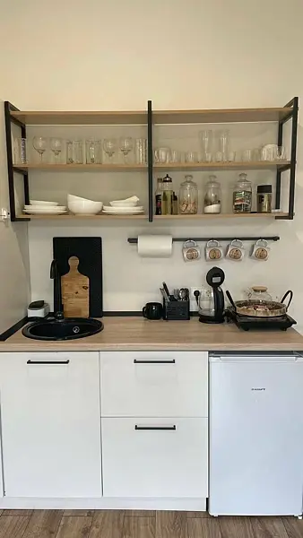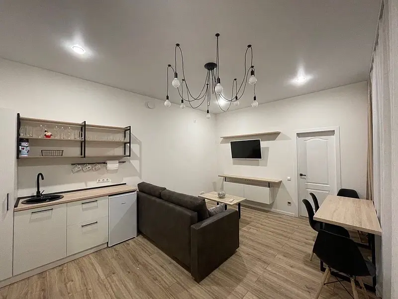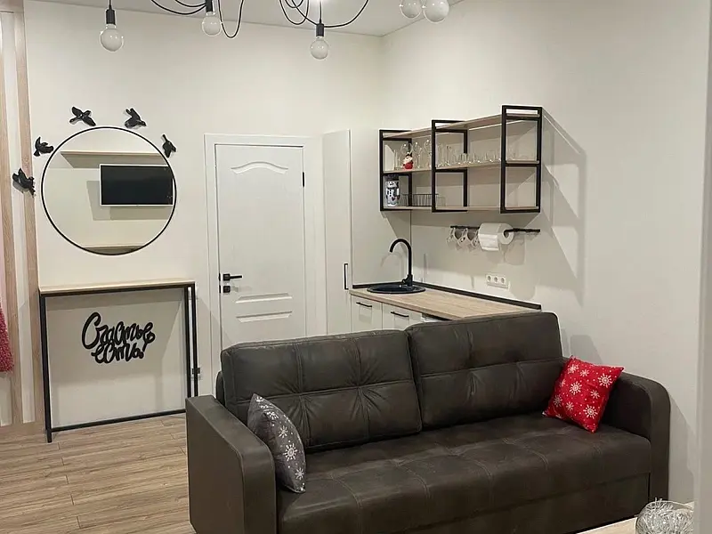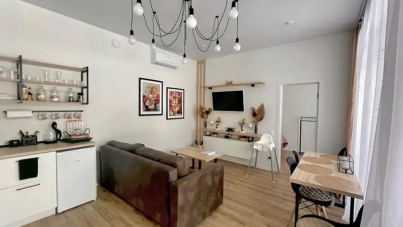 Гостиная-кухня с двуспальным диваном, столом и максимальным оснащением, авторские элементы декора, климат-контроль.
