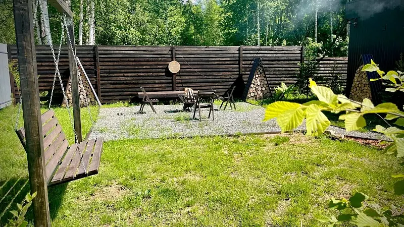 Помимо этого, в доме имеется сауна с панорамными окнами, а на территории банный чан. Отдохнуть на свежем воздухе можно на обустроенной веранде, а прохладным вечером собраться у костровой зоны. В летнее время устанавливается бассейн. Для юных гостей есть батут, песочница и домик.