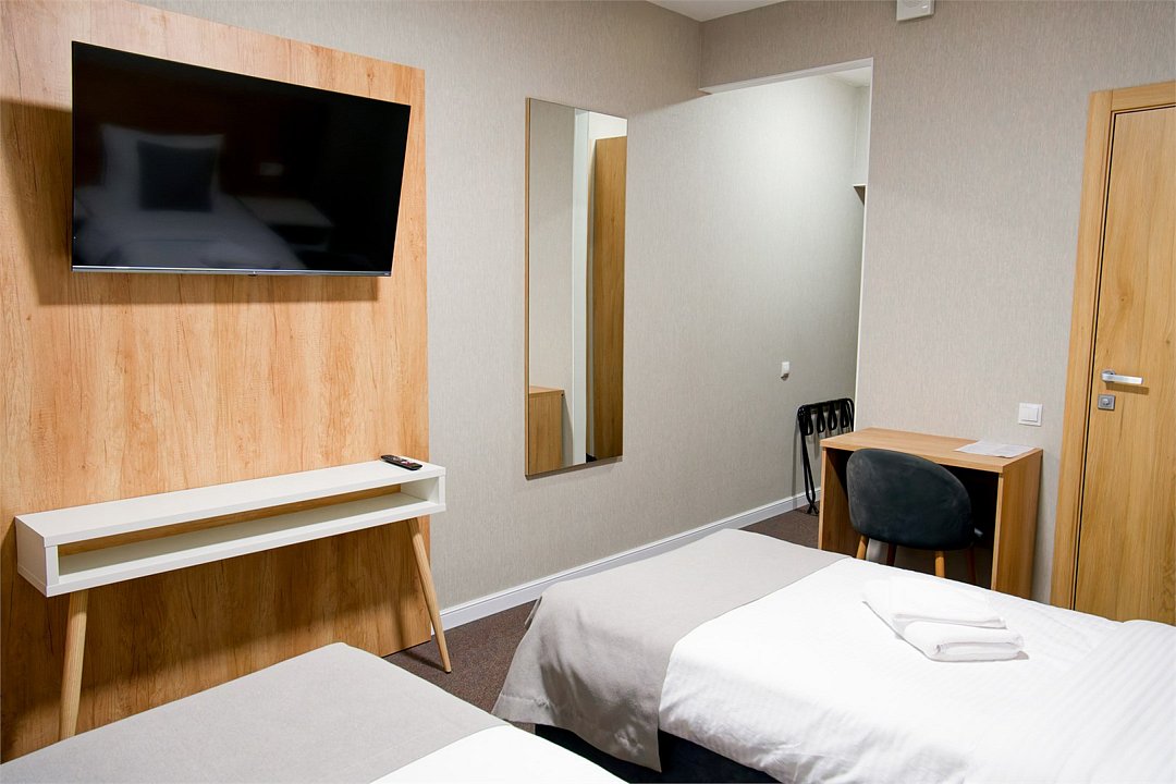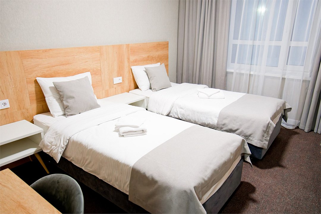 Уютный и светлый номер, идеально подходящий для друзей, коллег или гостей, предпочитающих раздельные кровати. Интерьер выполнен в спокойных, тёплых тонах с элементами натурального дерева, что создаёт атмосферу уюта и отдыха. В каждом номере: две удобные односпальные кровати с белоснежным бельём; современный телевизор; рабочая зона с зеркалом; вместительный шкаф; чайный набор (чайник, чашки, стаканы); собственная ванная комната с душем, феном и туалетными принадлежностями. Номера расположены на 2 и 3 этажах отеля Этот вариант подойдёт как для короткой деловой поездки, так и для отдыха после активного дня в горах.Услуги и удобства
