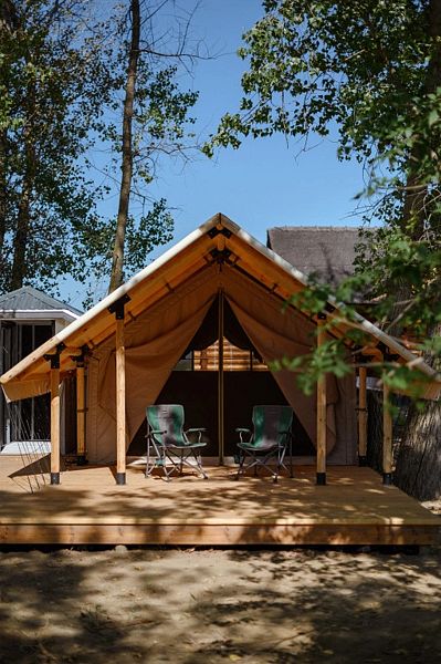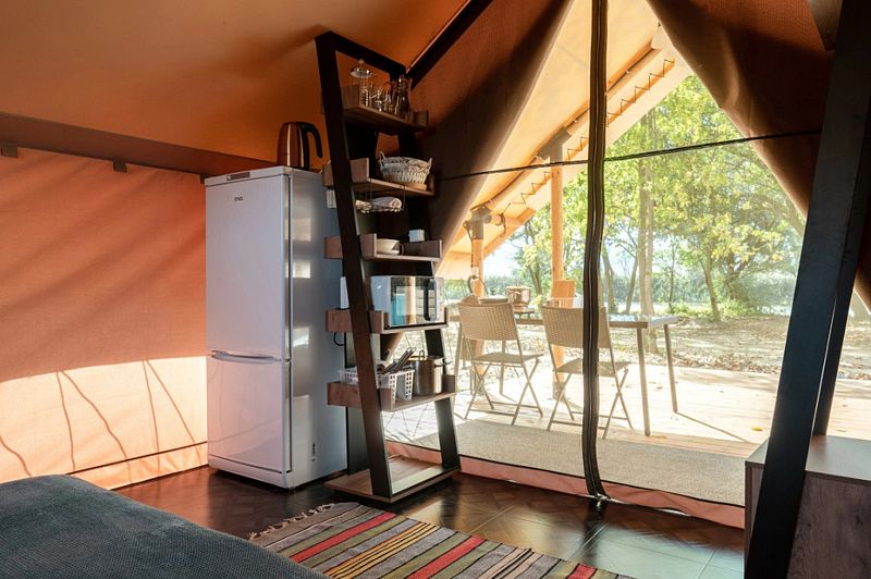 Сафари-Тент, 36 м², 2 комнаты. Вместимость до 4 мест. Один ребёнок до 12 лет — может разместиться без отдельного спального места. Имеется собственный санузел, зона барбекю и индивидуальный выход к пирсу для рыбалки.