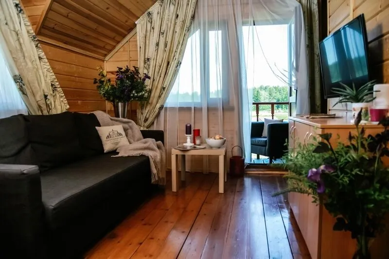 Полноценный номер в коттедже, рассчитанный на двоих, расположен на первом этаже и оборудован отдельным входом. В номере: прихожая, санузел с душевой кабиной, гостиная (ЖК-телевизор, шкаф для одежды, журнальный столик, кресло и диван), спальня с двуспальной кроватью, столиком и двумя креслами, мини-кухня (холодильник, микроволновка, чайник).