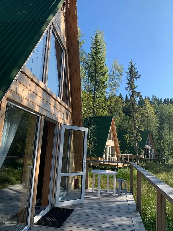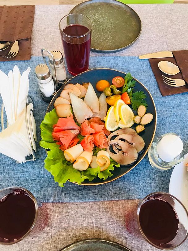 На территории этно-хутора находится уютное кафе, где гости могут попробовать разнообразные блюда как карельской, так и европейской кухни, включая домашнюю выпечку и эксклюзивные наливки. В меню также предусмотрены продукты для самостоятельного приготовления, такие как свежая рыба, мясо для шашлыка и ароматные овощи, что позволяет каждому организовать идеальный ужин на открытом воздухе.