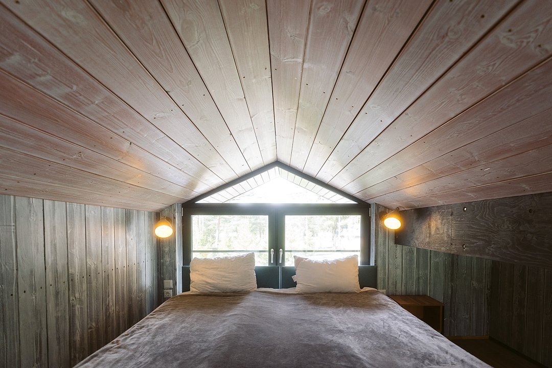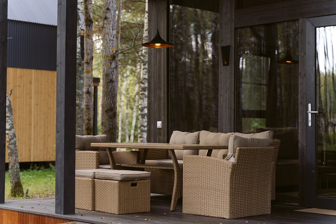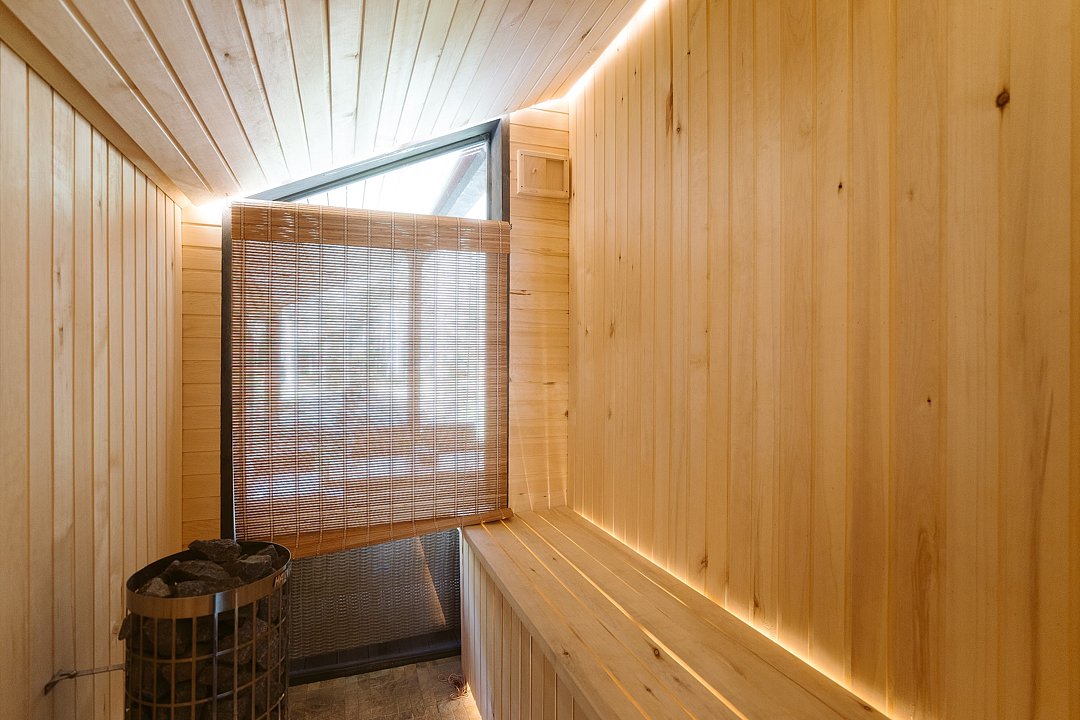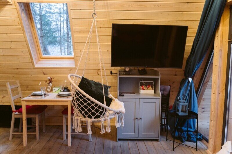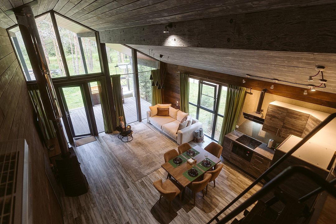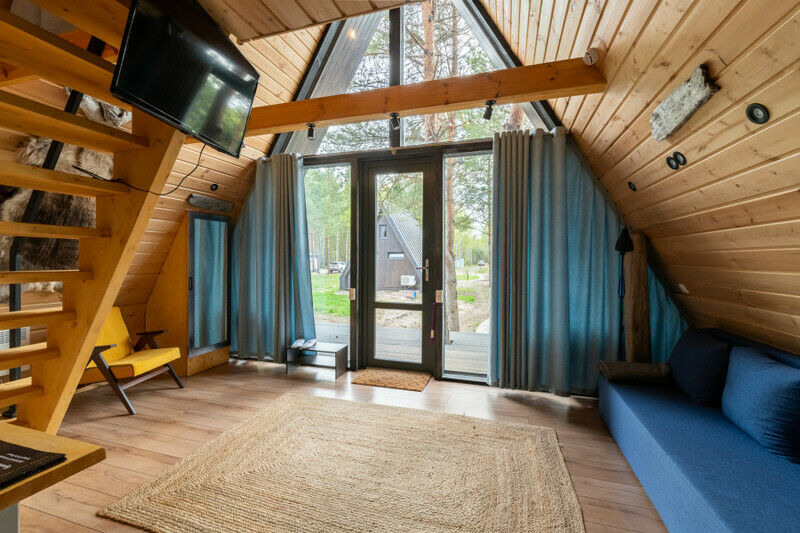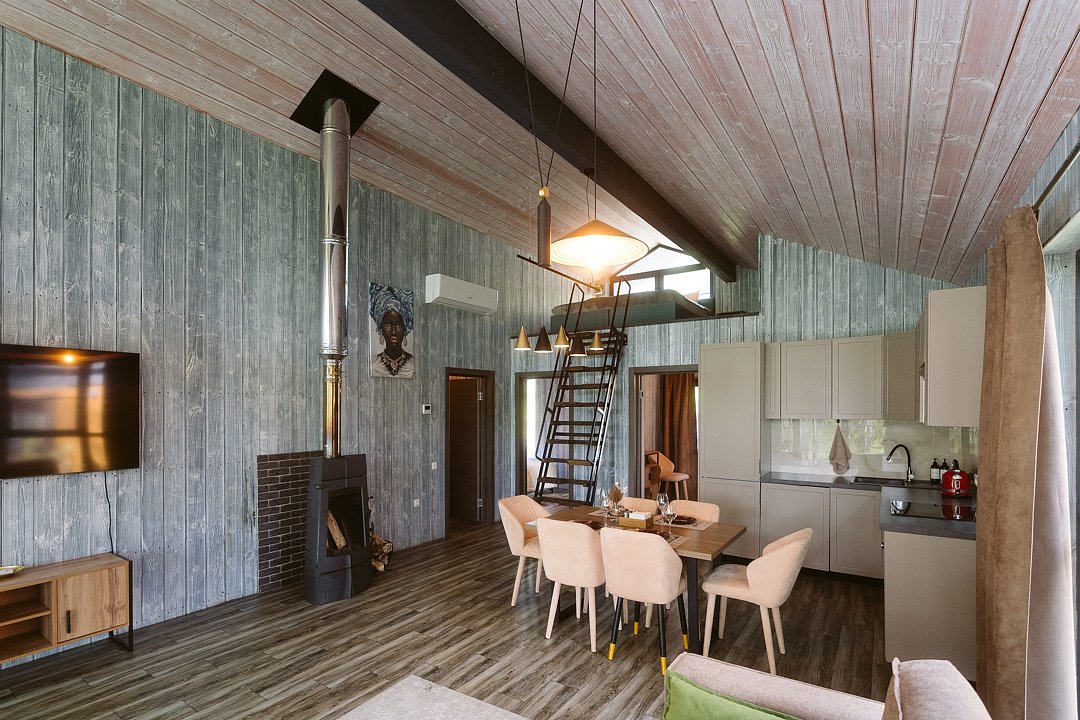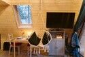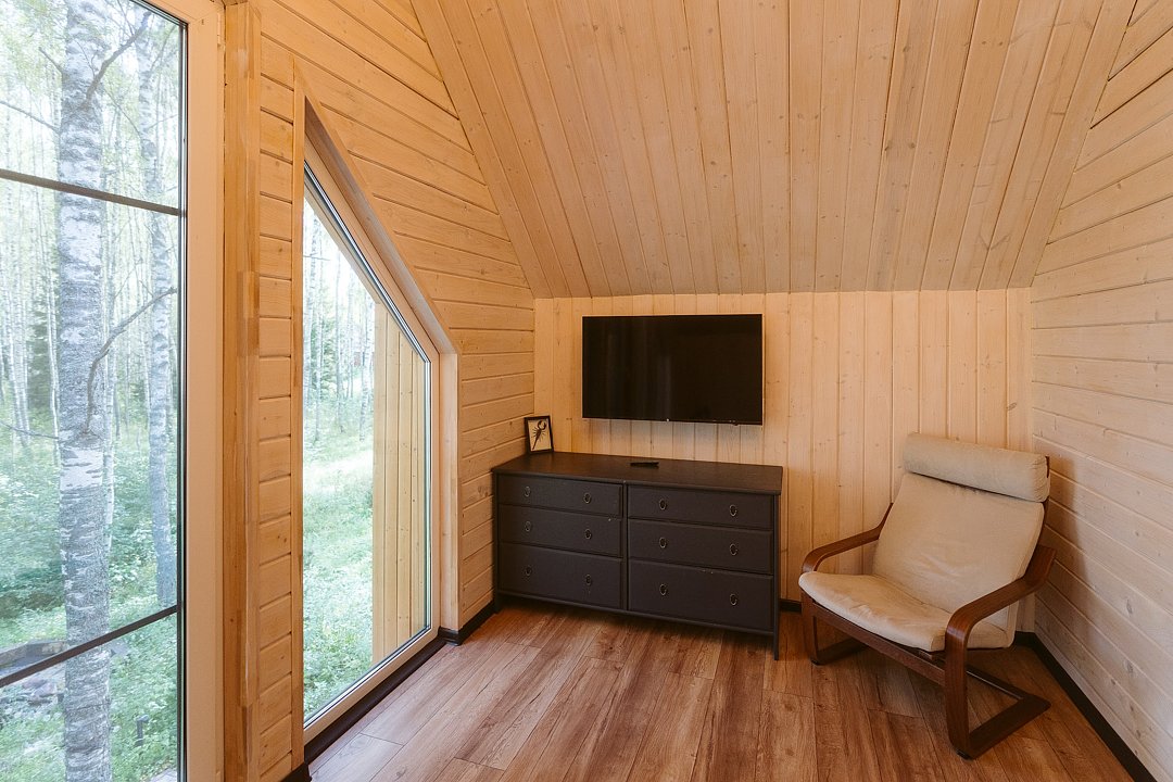 Гостиная совмещена с кухней и обеденной зоной. Увеличенная терраса с грилем и уличной мебелью для завтраков под теплыми лучами солнца и отдыха под открытым небом с видом на озеро. В этом уютном домике с большим панорамным окном есть своя собственная сауна. Максимальная её температура составляет 60°. Подходит для компании друзей или семьи. На заднем дворике расположена барбекю зона.