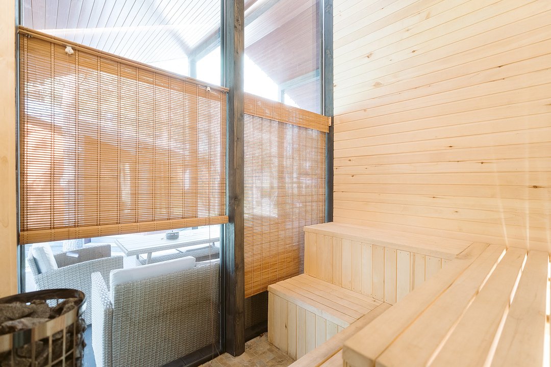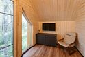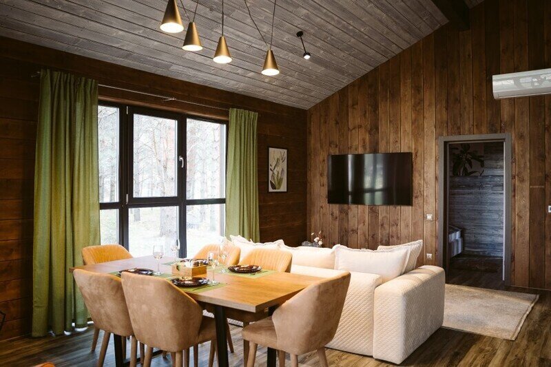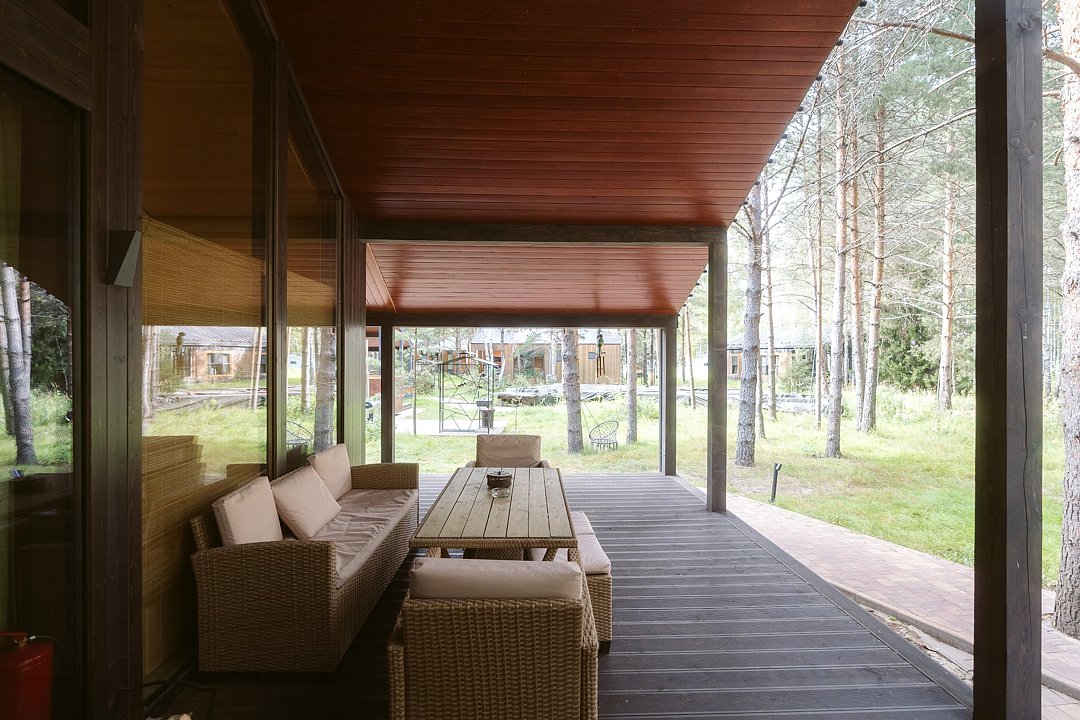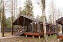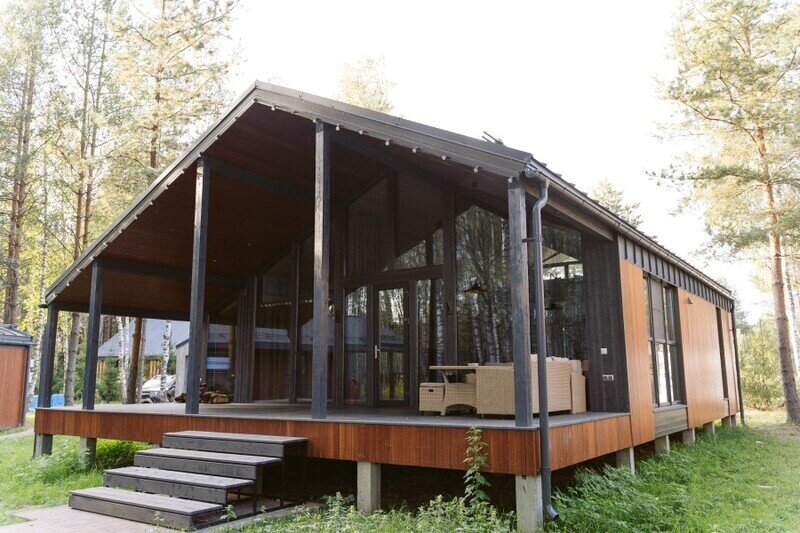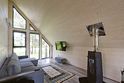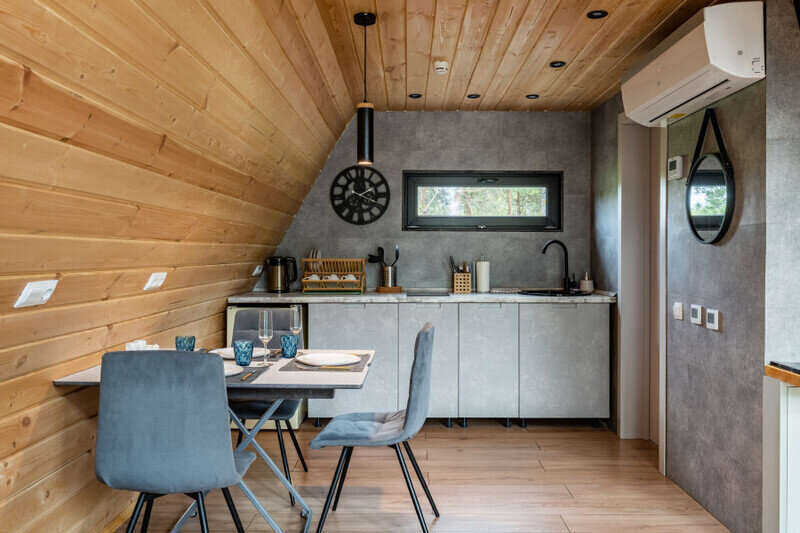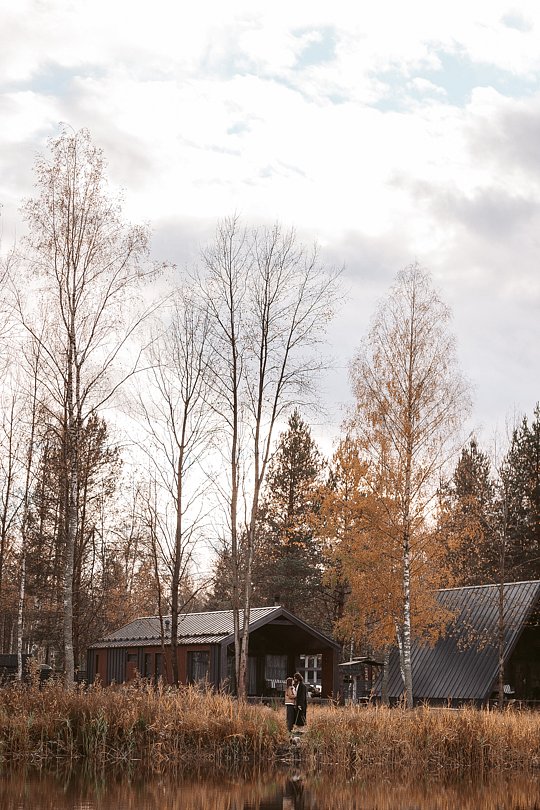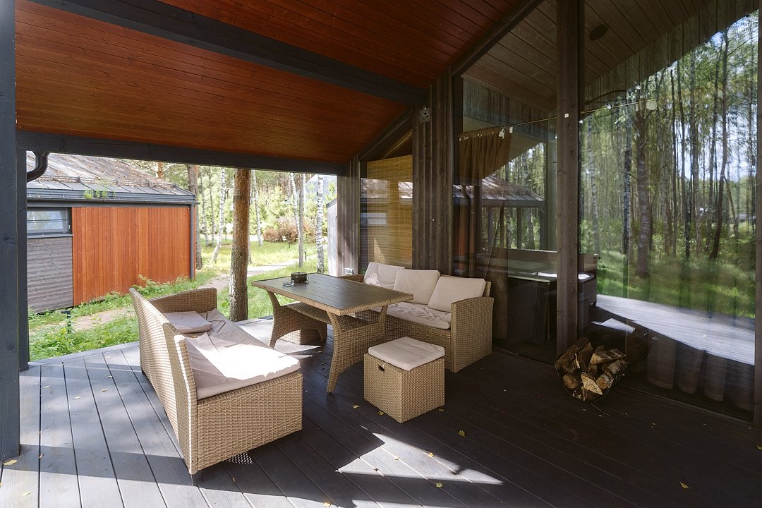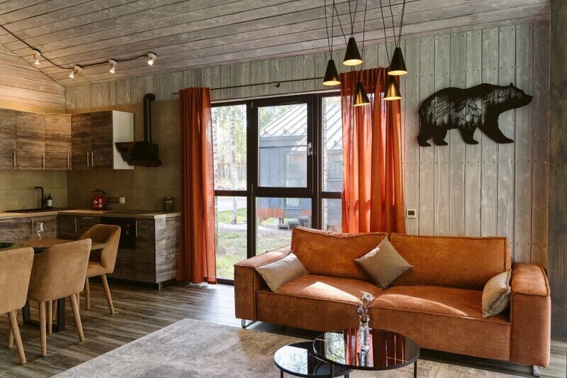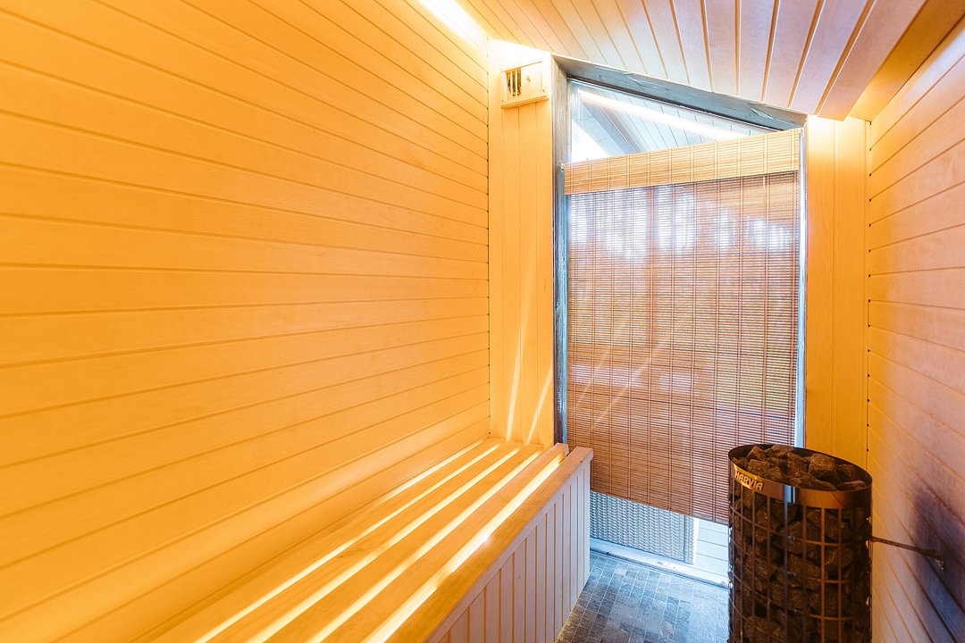 Гостиная совмещена с кухней и обеденной зоной. Увеличенная терраса с грилем и уличной мебелью для завтраков под теплыми лучами солнца и отдыха под открытым небом с видом на озеро. В этом уютном домике с большим панорамным окном есть своя собственная сауна. Максимальная её температура составляет 60°. Подходит для компании друзей или семьи. На заднем дворике расположена барбекю зона.