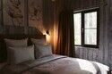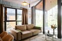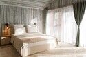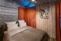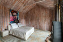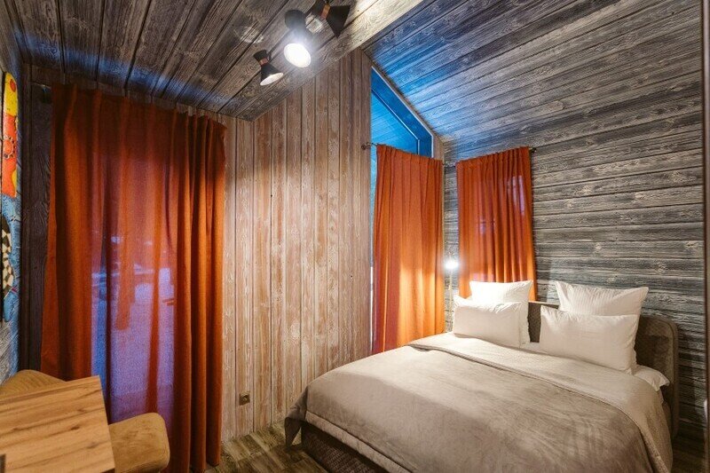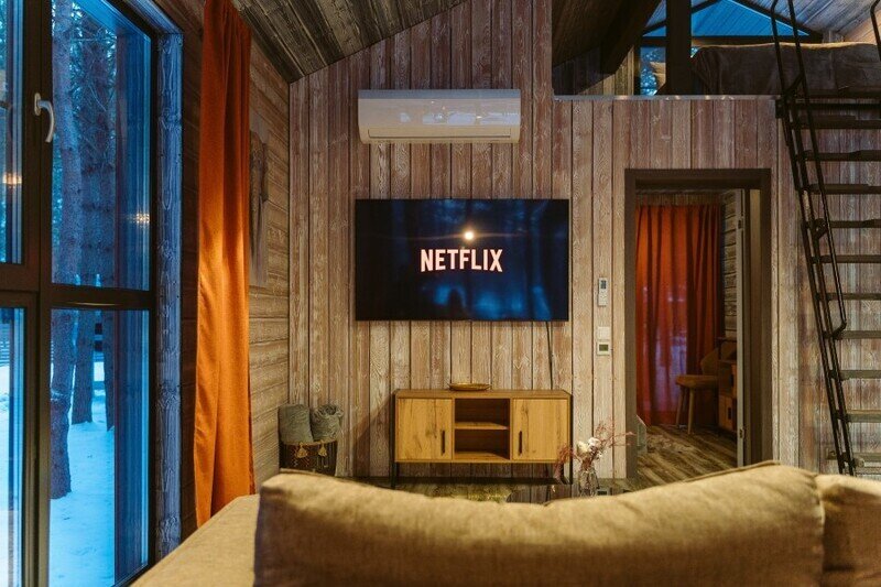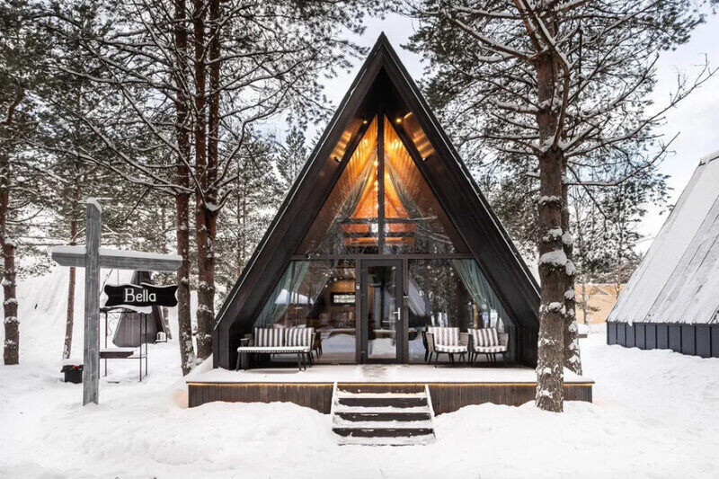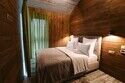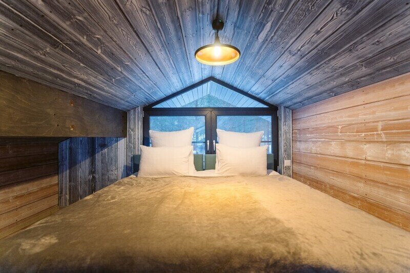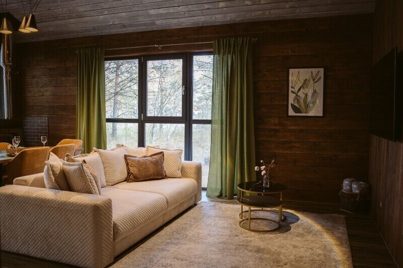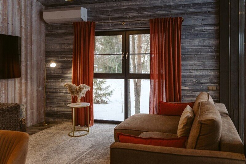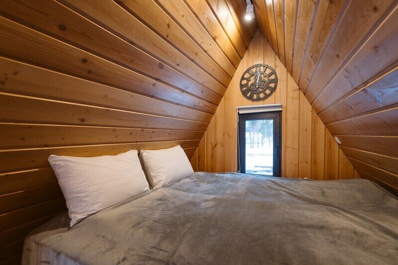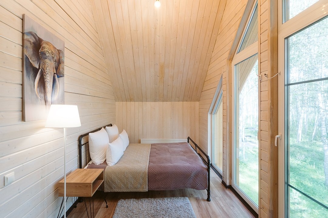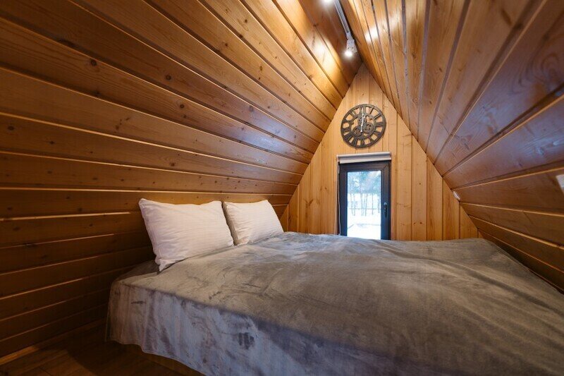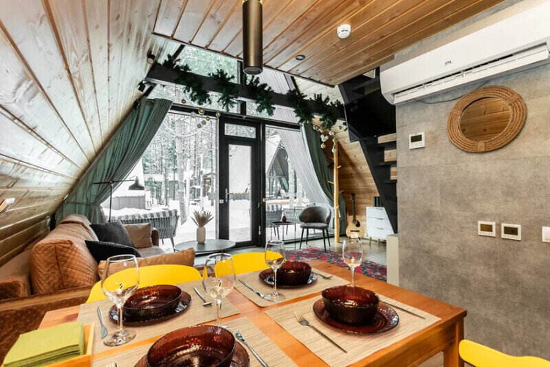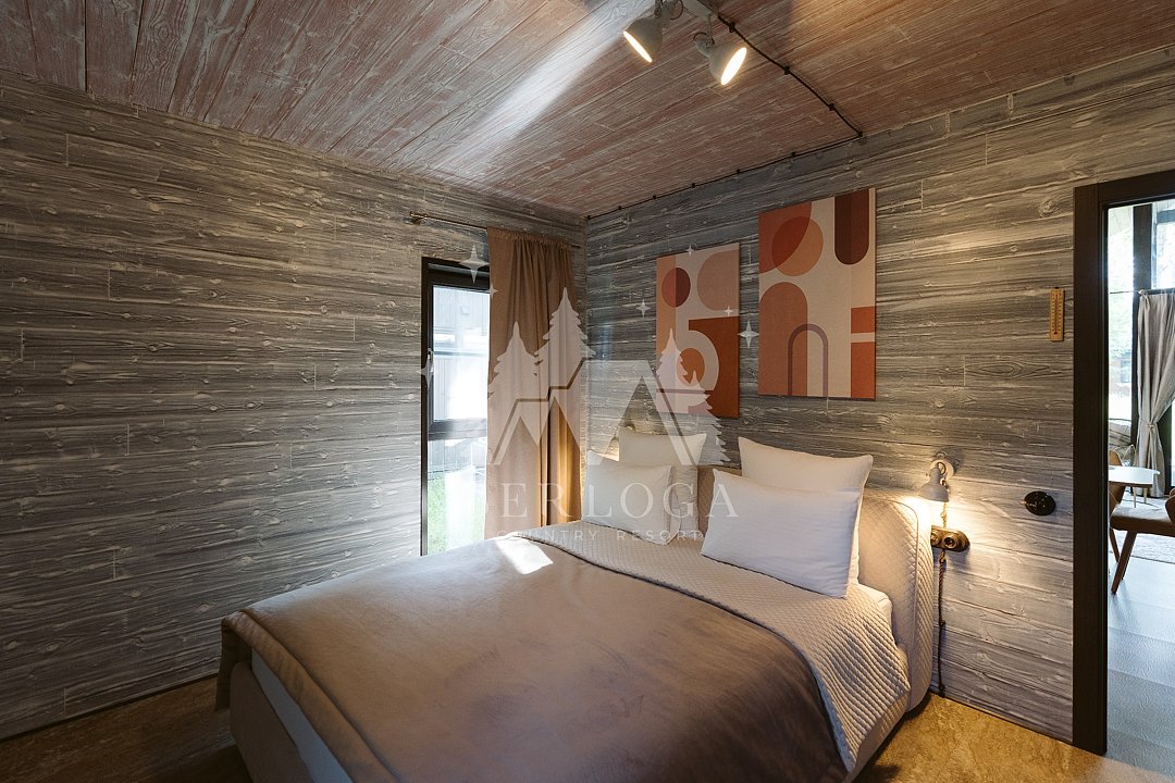 Сказочный домик с одной изолированной спальней с кроватью KingSize, гостиная с камином большим диваном кроватью с панорамными окнами и сауной.