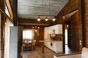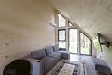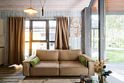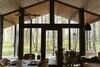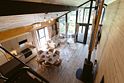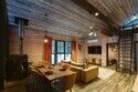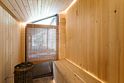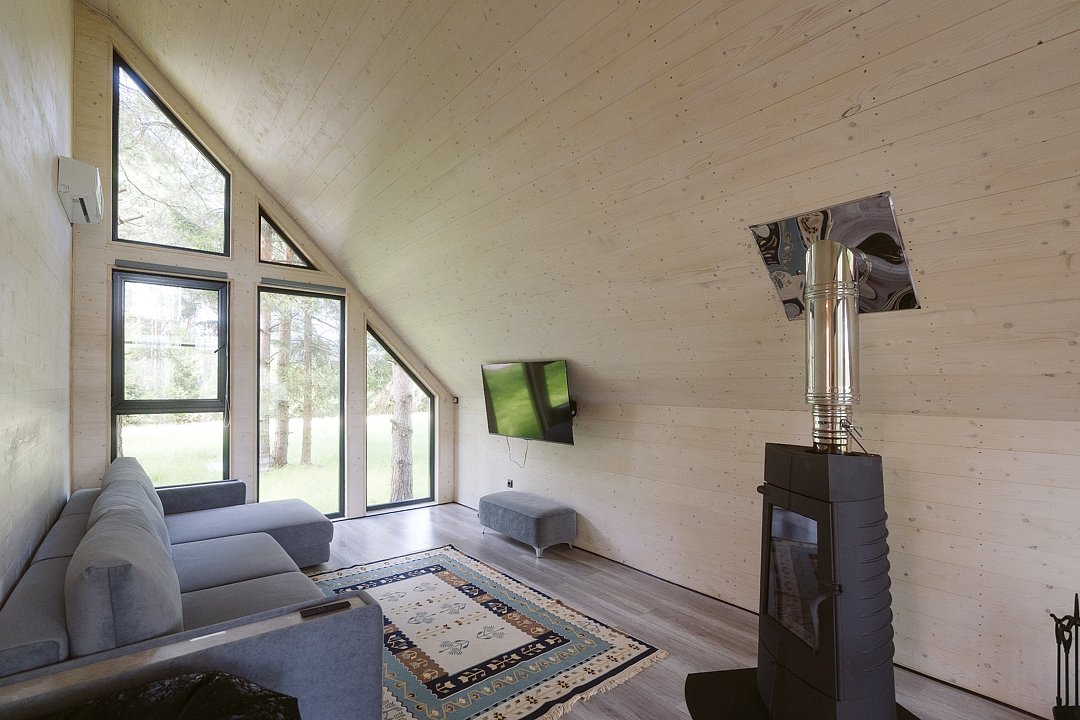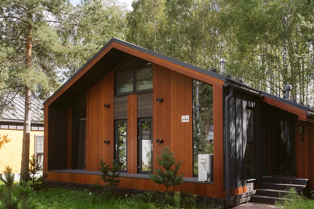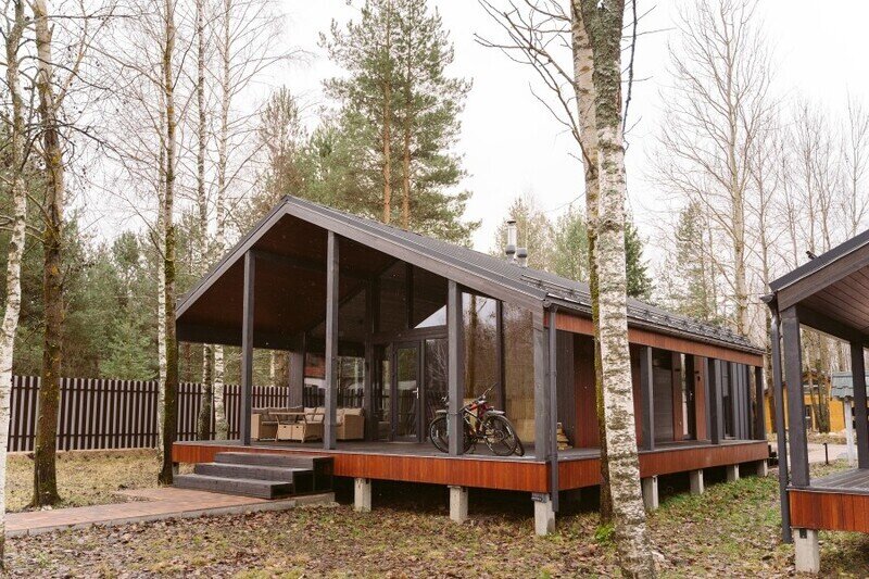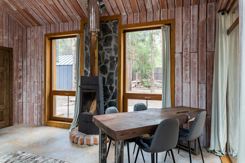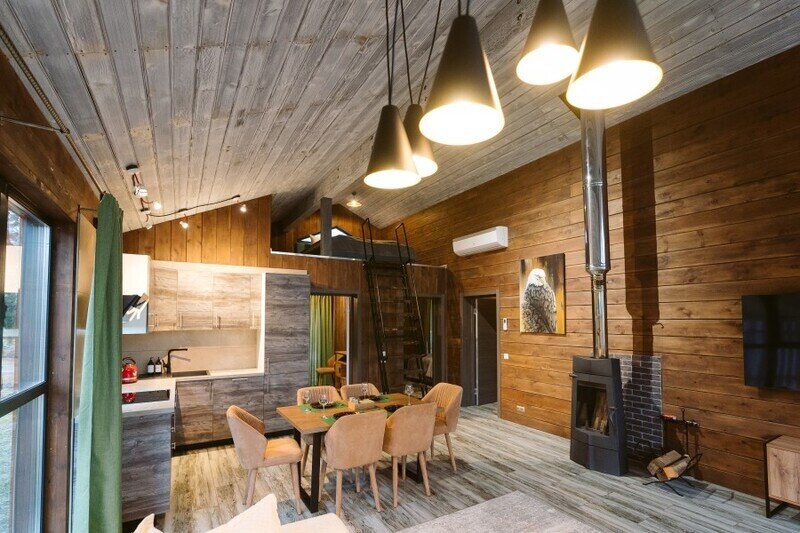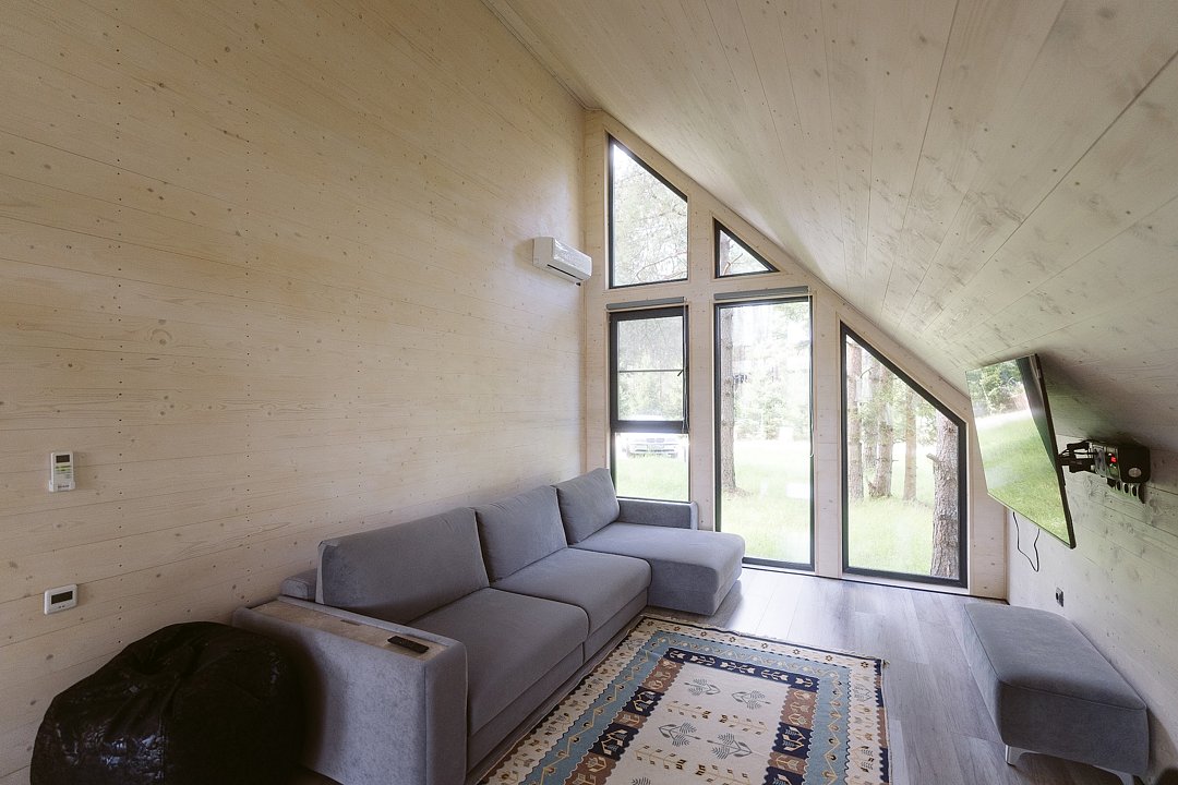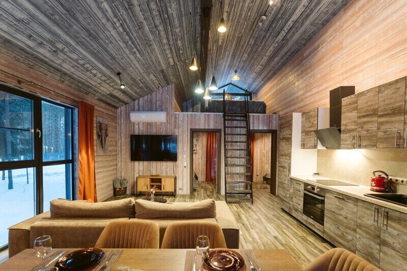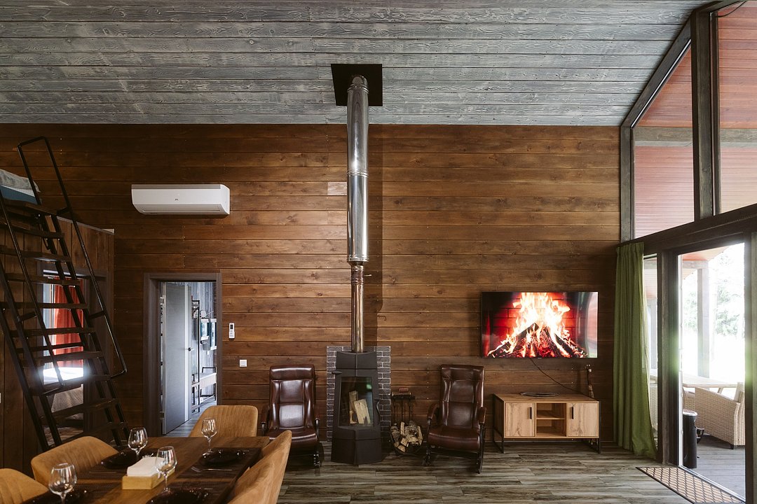 Дом с двумя спальнями и кухней гостиной с диваном кроватью, панорамным окном, камином и сауной.