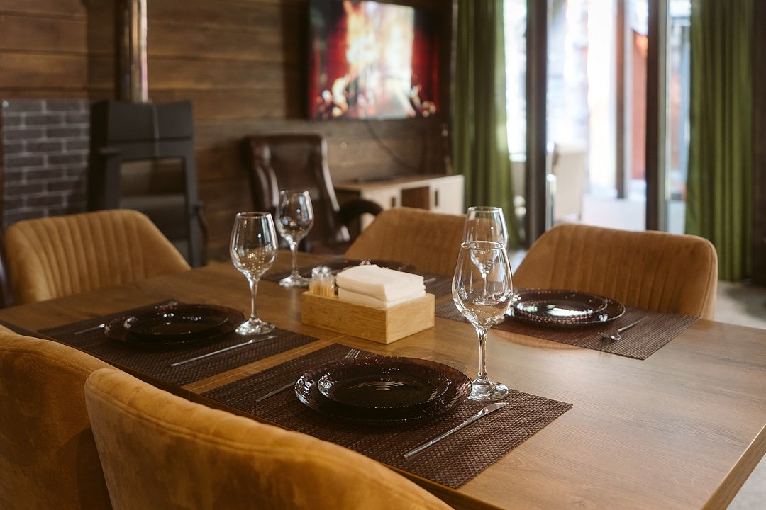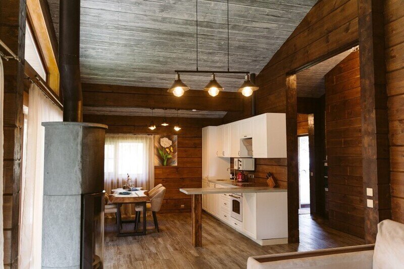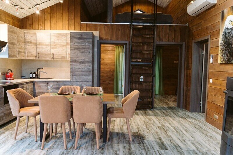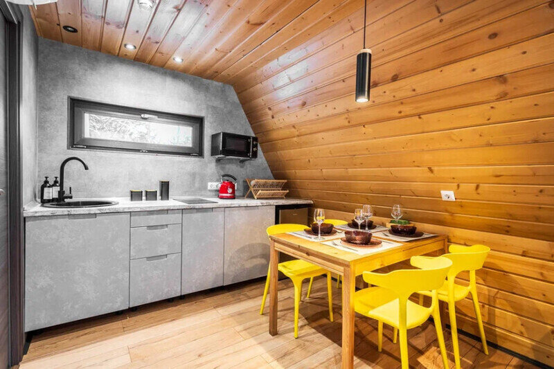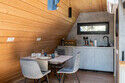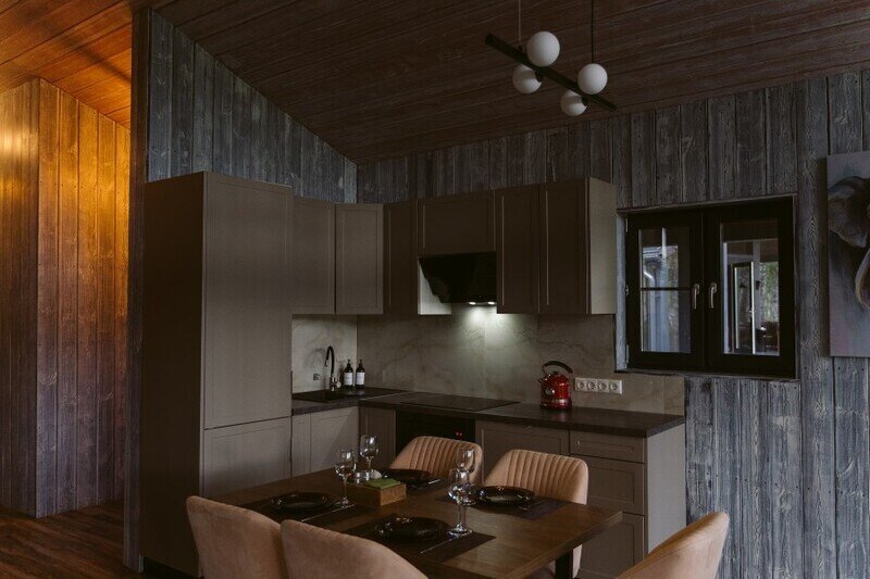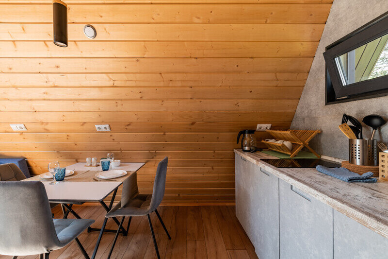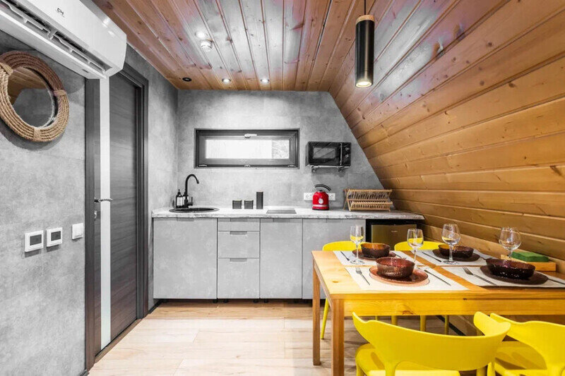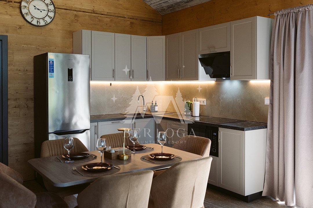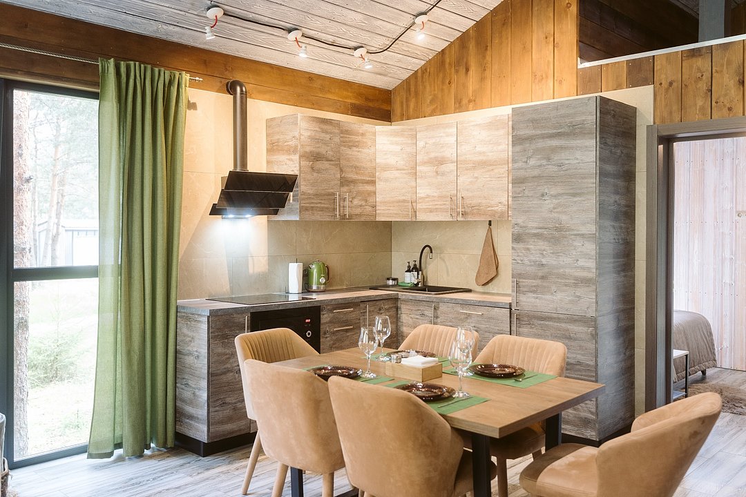 Для тех, кто привык питаться домашней едой, в домах имеется собственная кухня с холодильником, микроволновой печью, плитой, чайником и набором посуды. А на террасе обустроена мангальная зона.