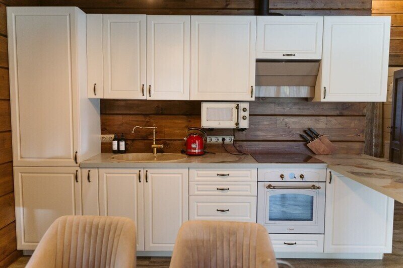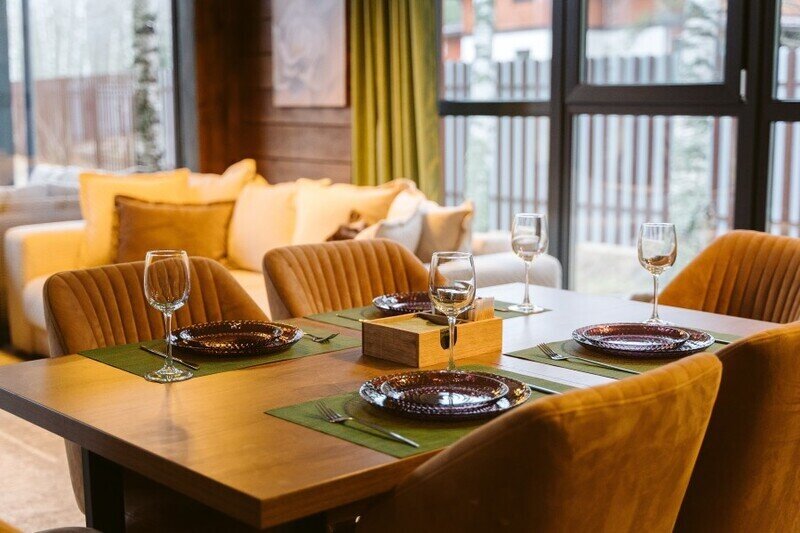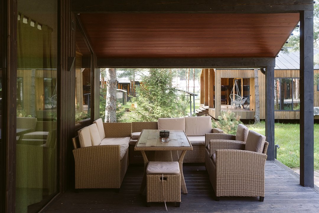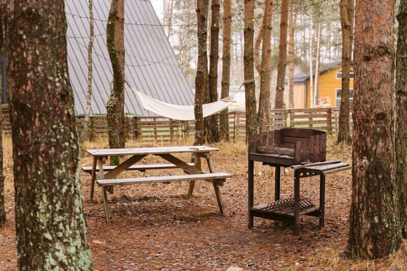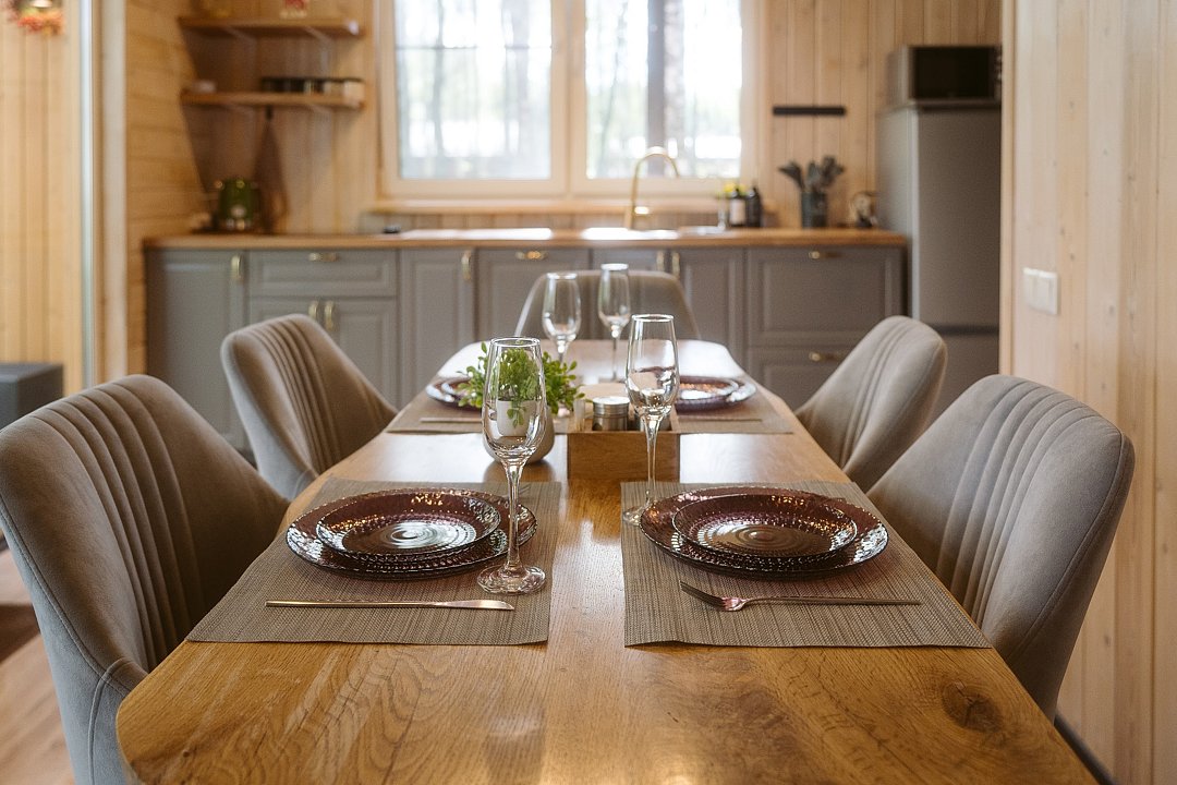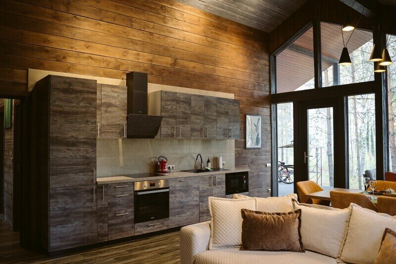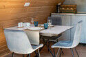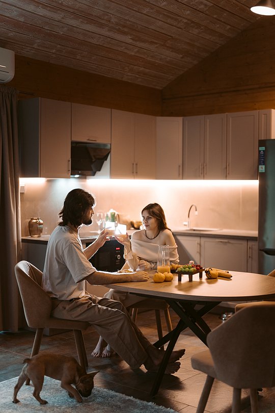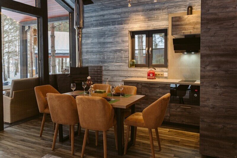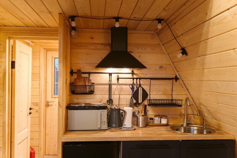 Для тех, кто привык питаться домашней едой, в домах имеется собственная кухня с холодильником, микроволновой печью, плитой, чайником и набором посуды. А на террасе обустроена мангальная зона.