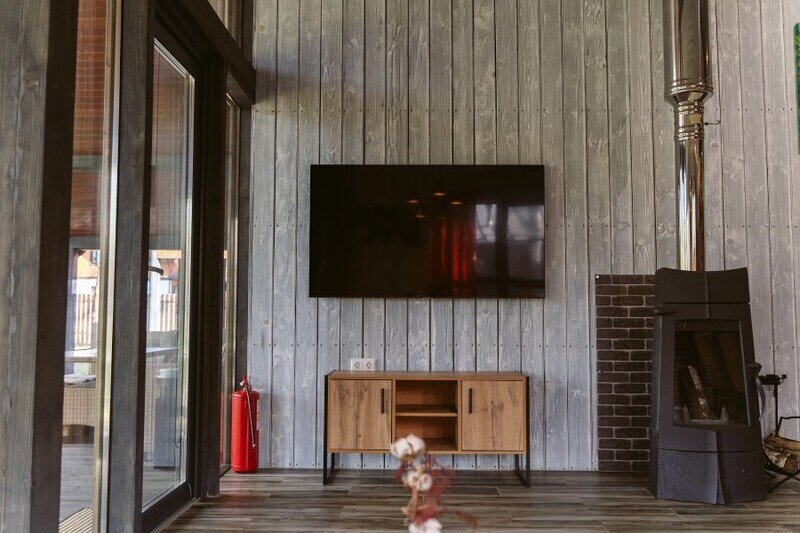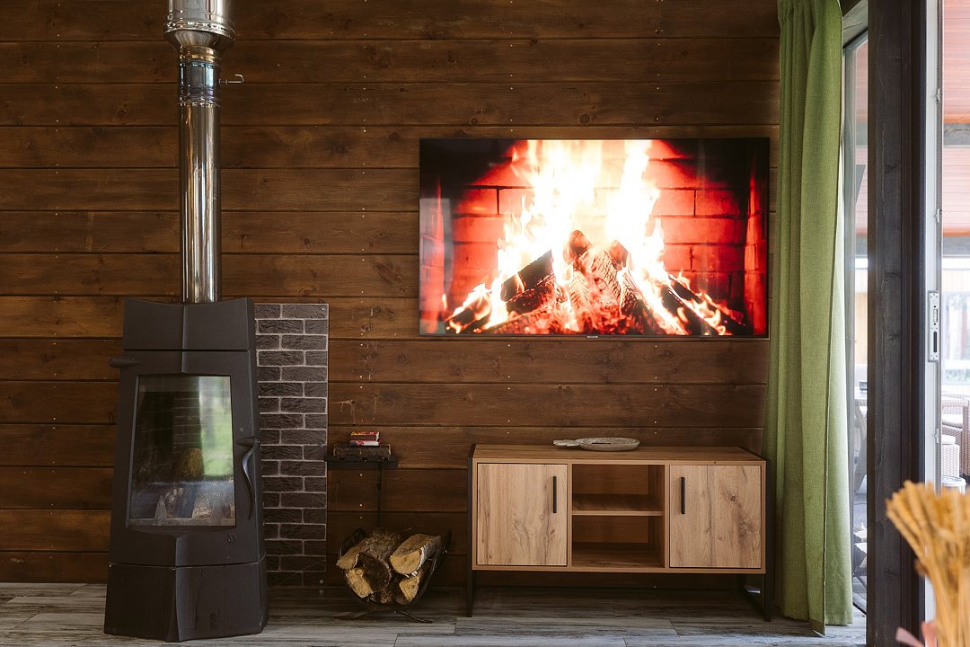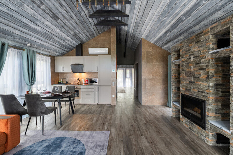 Дом с двумя спальнями, с кухней гостиной, панорамным окном и камином.