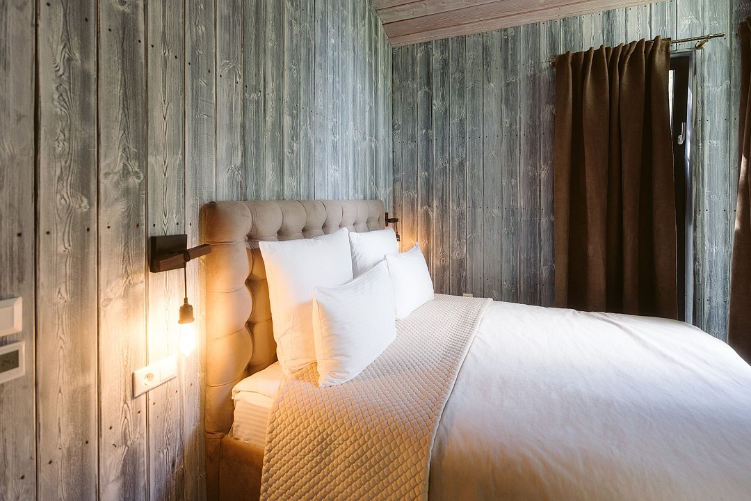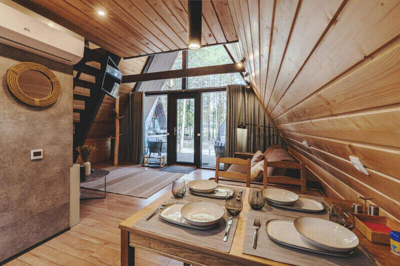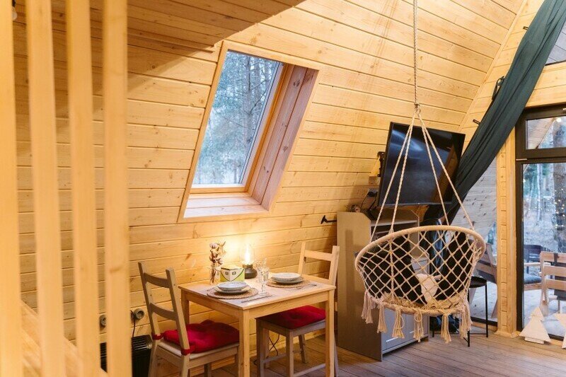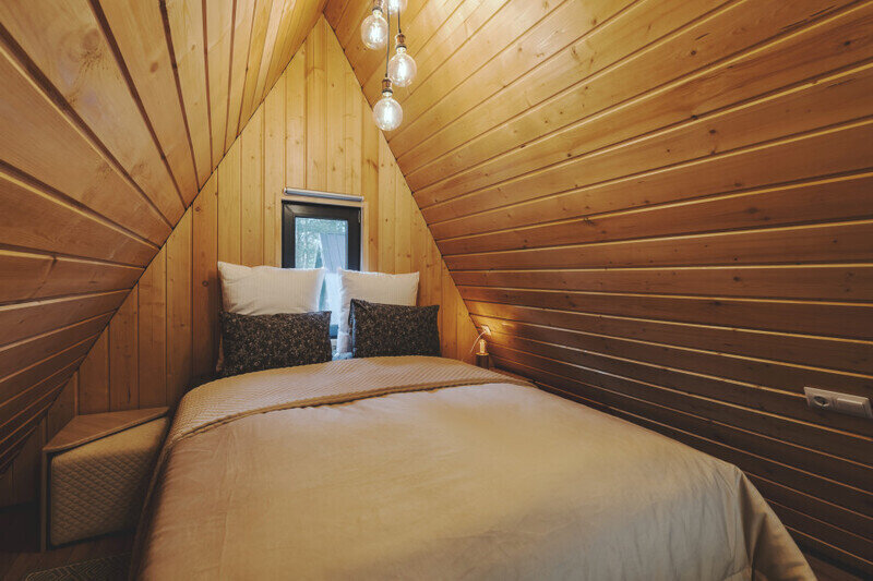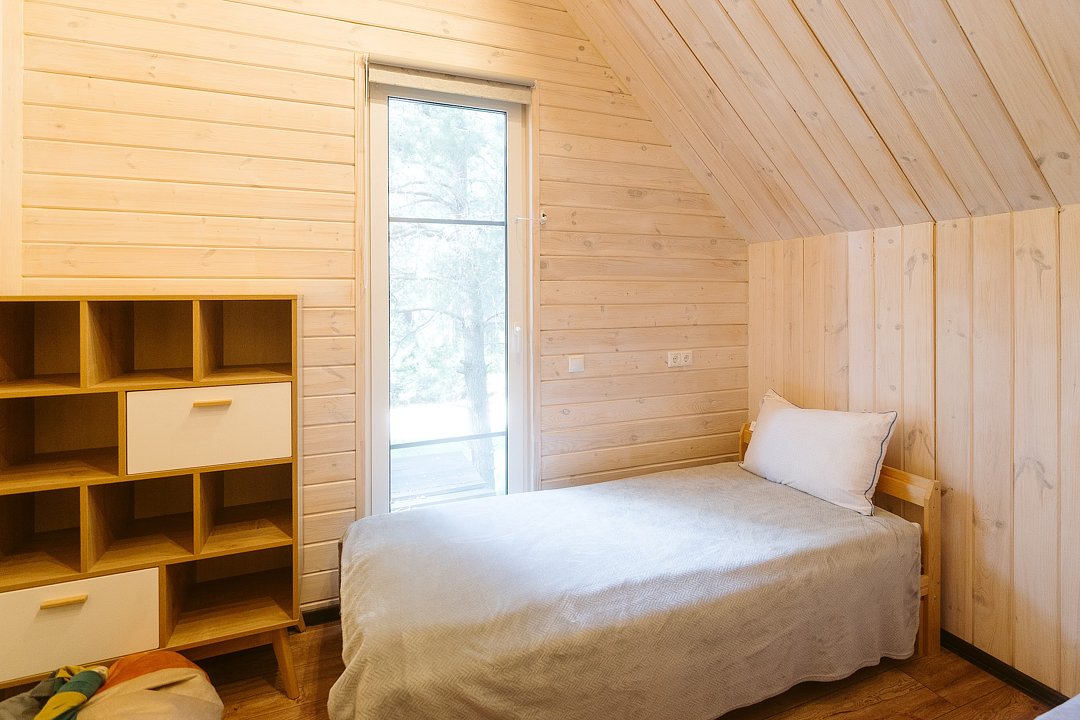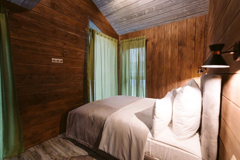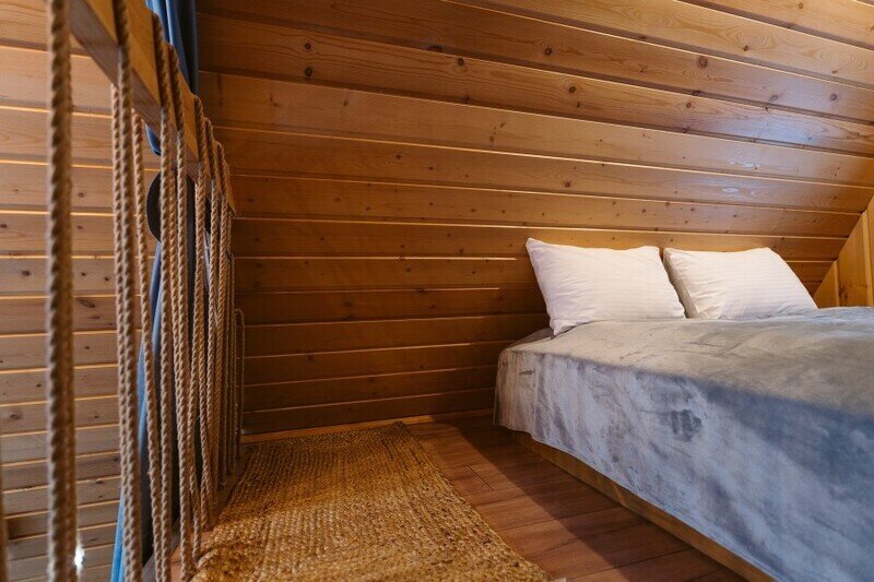 Здесь вы найдёте все условия для комфортного проживания, ведь домики хорошо оснащены. В каждом из них есть спальня, кухня-гостиная и собственный санузел. Для гостей подготовлено постельное белье, набор полотенец и гигиенические средства, а также предоставляется питьевая вода, набор чая, сахар и специи. Из оборудования имеется телевизор, фен, кондиционер, а также беспроводной интернет.