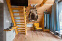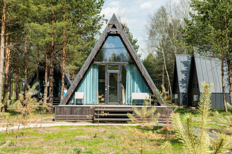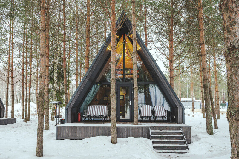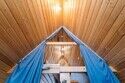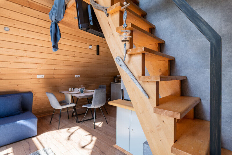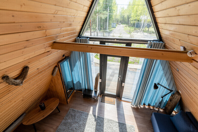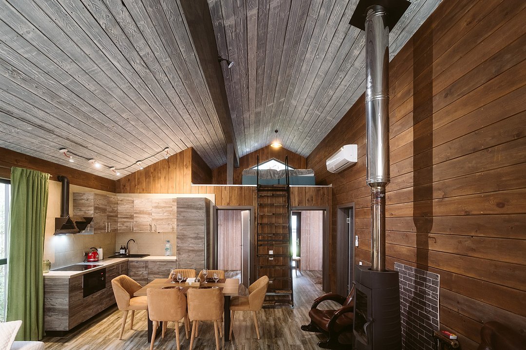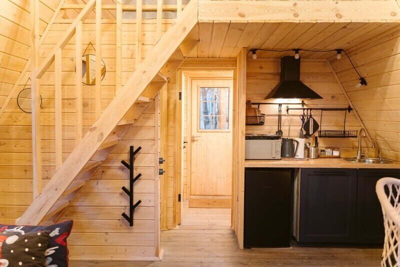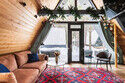 Двухэтажный дом A-Frame с лестницей вверх с кроватью KingSize и просторной кухней гостиной с диваном кроватью.
