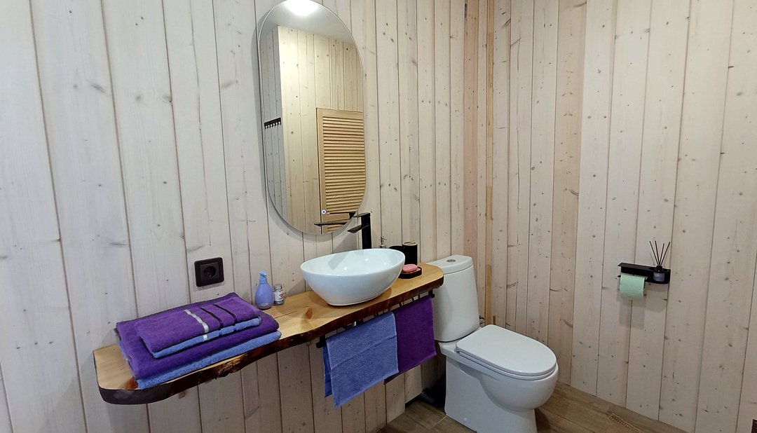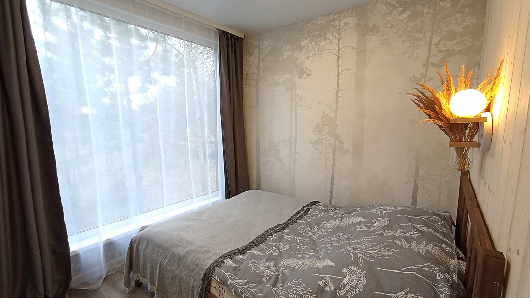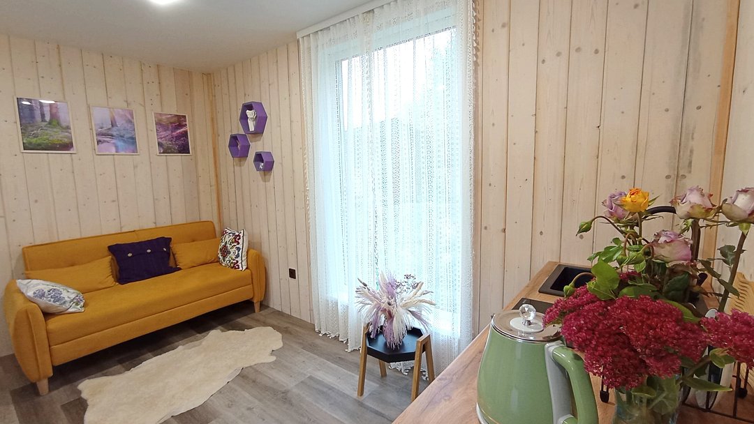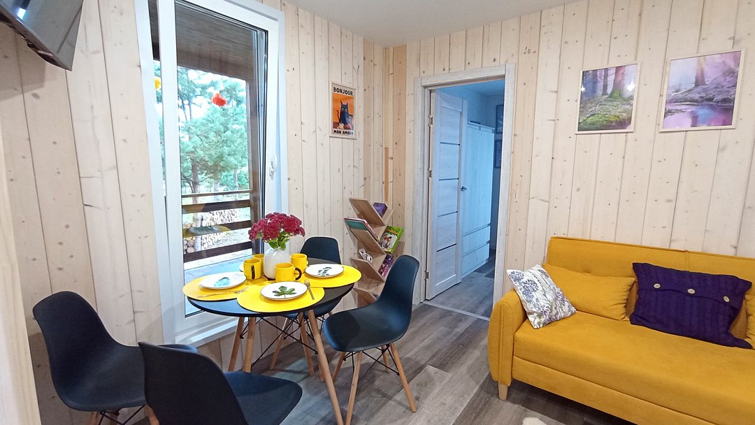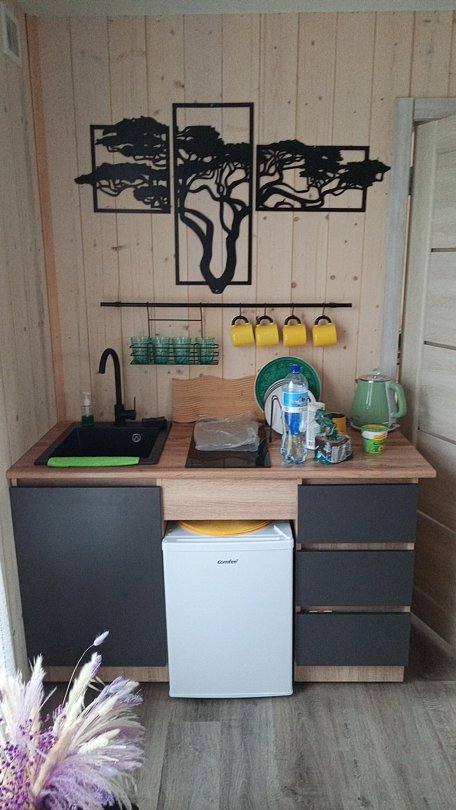 Домик вмещает двух человек, но при необходимости можно разместить четверых. Внутри вас ждет все необходимое для комфортного проживания: