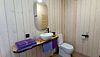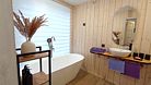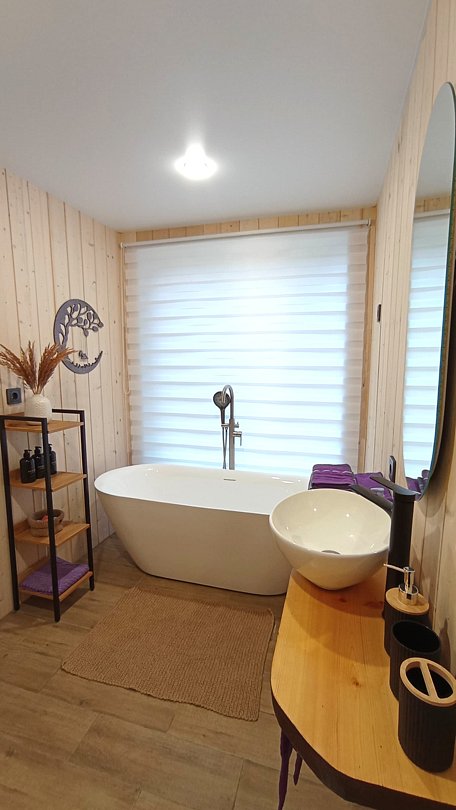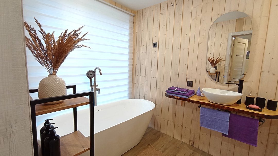 - Ванная комната с панорамным окном, откуда открывается вид на лес.