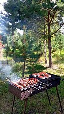 Мангальная зона со всем необходимым (шампура, решетка для гриля, дрова).