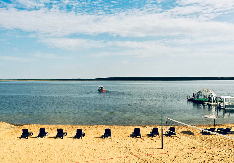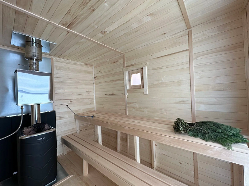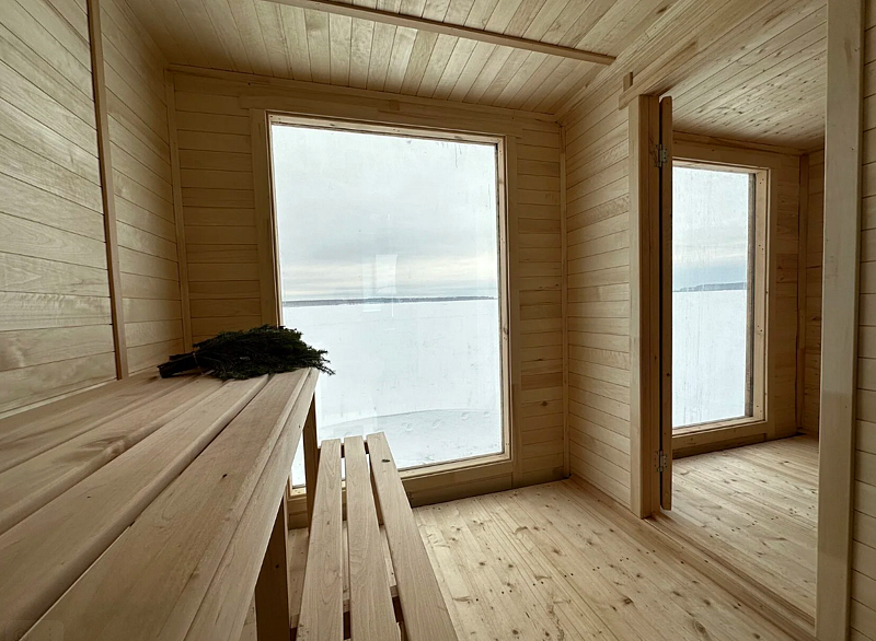 Баня и беседка установлены на понтонах и находятся прямо на воде, поэтому можно купаться прямо с палубы. Баня включает в себя парилку, помывочную и просторную комнату отдыха с принадлежностями для чаепития. Также имеется биотуалет. На террасе располагается прозрачная купольная беседка с мангалом, диваном и столом.Цена: