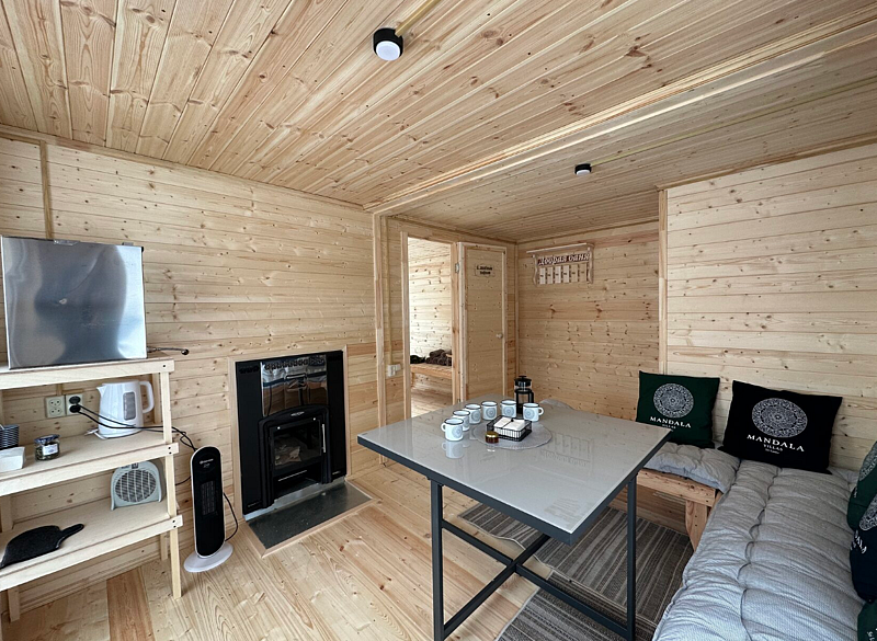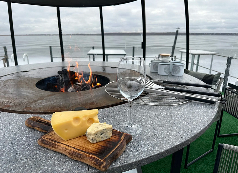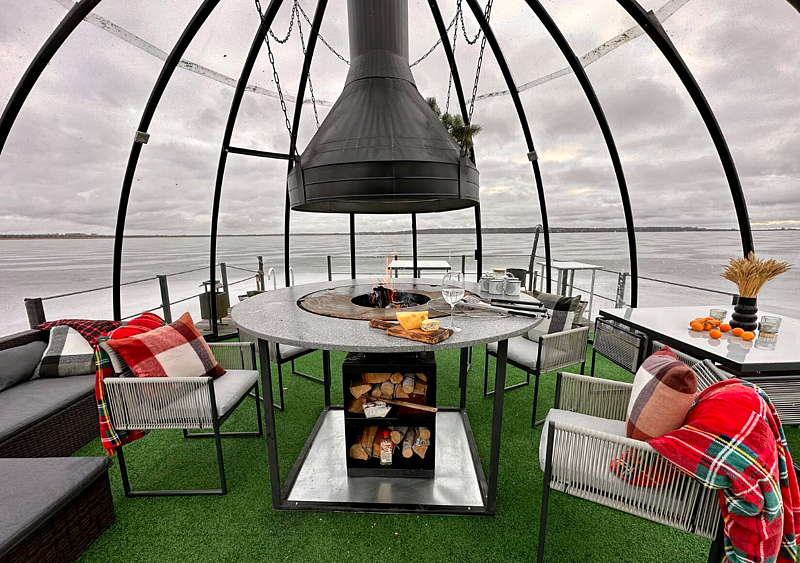Уютный овальный домик с панорамным видом на озеро. В нем есть все необходимое для комфортного пребывания на природе.
